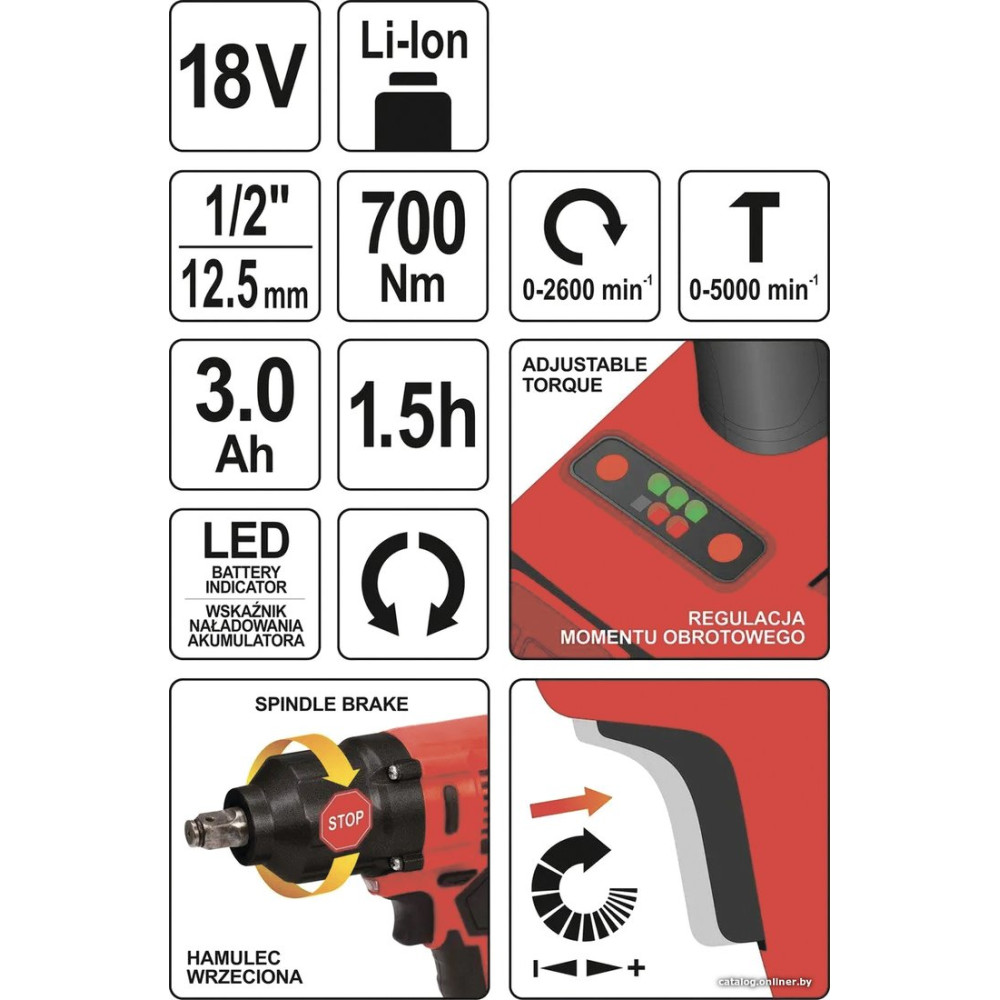 питание: аккумуляторный, Li-ion, 2600 об/мин, 700 Н·м, напряжение аккумулятора: 18 В, ёмкость аккумулятора: 3 А·ч, аккумулятор в комплекте