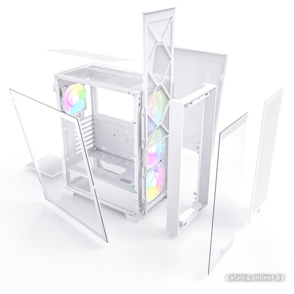 Mid Tower, БП отсутствует, для плат ATX/micro-ATX/mini-ITX, с 4 вентиляторами в комплекте, окно: закаленное стекло, видеокарта до 340 мм, охлаждение ЦП до 170 мм, пылевой фильтр - спереди/снизу, 1xUSB 2.0, 2xUSB-A 3.2 5Гбит/с, цвет белый