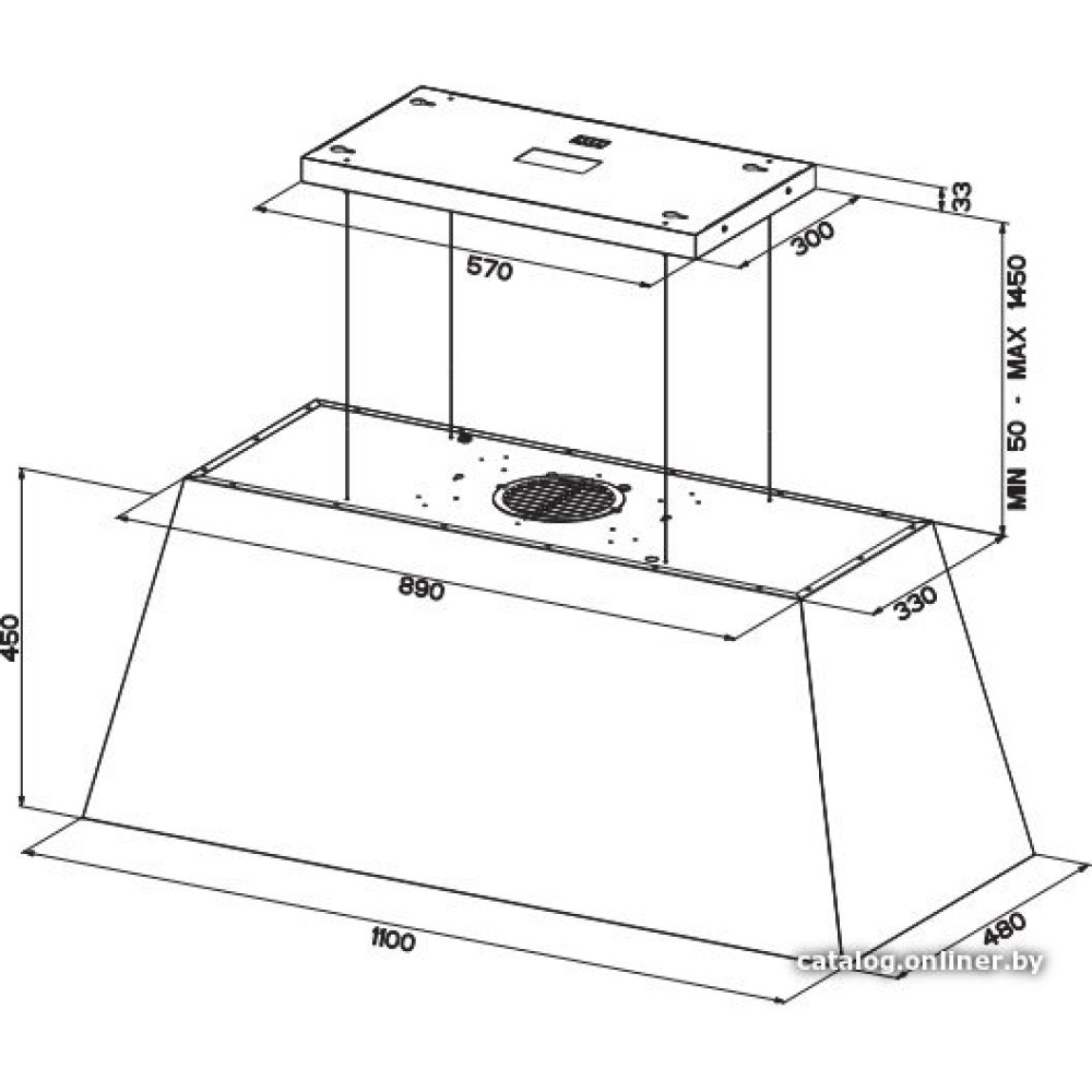 конструкция купольная, монтаж островной, ширина 110 см, управление электронное/поворотный переключатель, производительность вытяжки 570 м³/ч, цвет серый