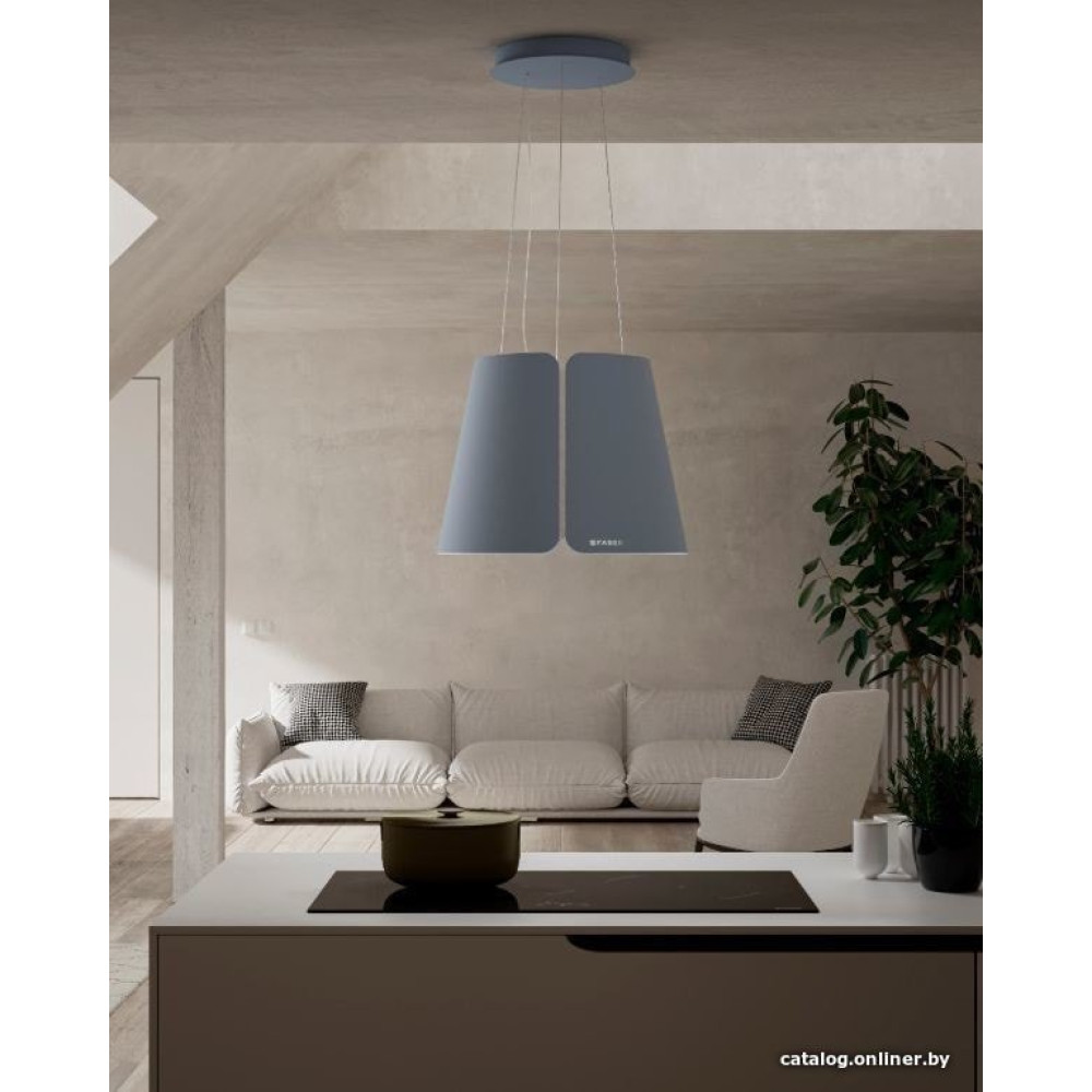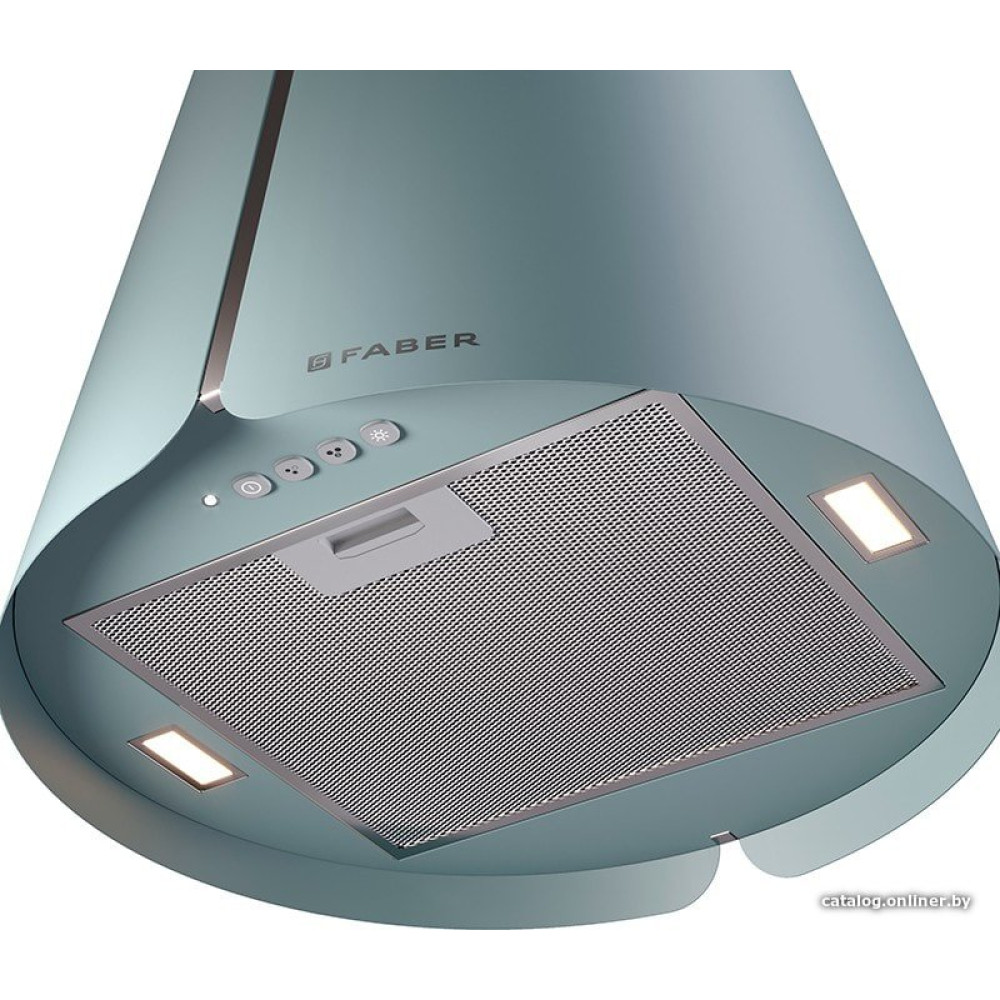 конструкция коробчатая, монтаж островной, ширина 43 см, управление электронное/кнопочное, производительность вытяжки 600 м³/ч, производительность мотора 1000 м³/ч, цвет голубой