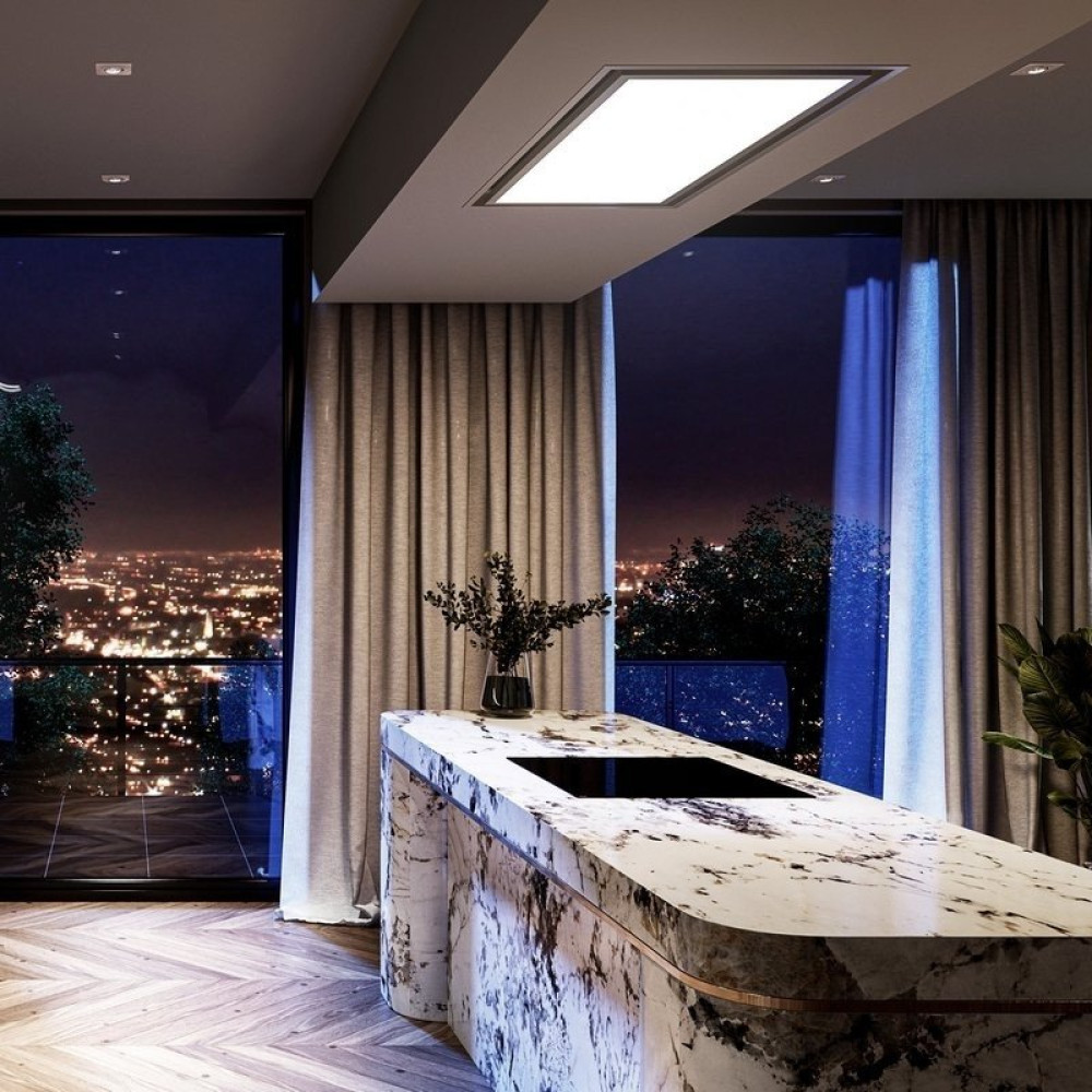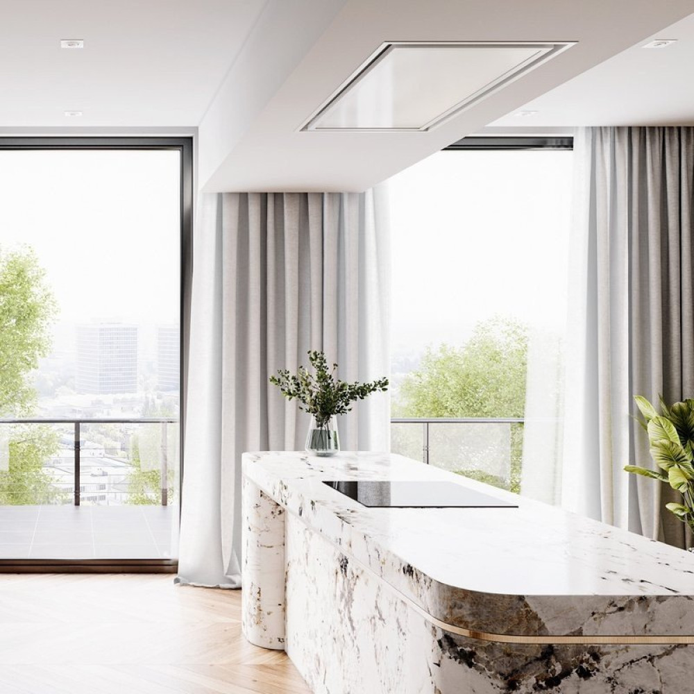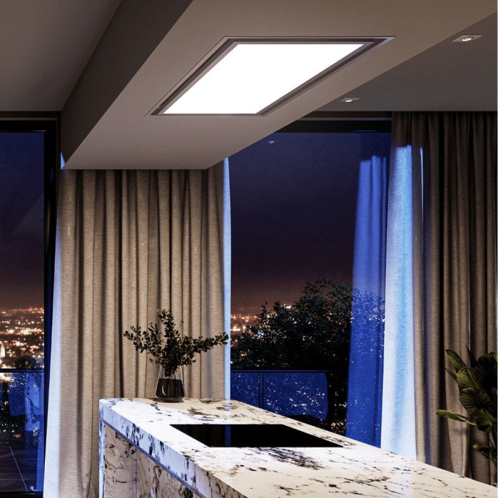 конструкция скрытая, монтаж для встраивания, ширина 120 см, управление дистанционное, производительность вытяжки 596 м³/ч, цвет белый