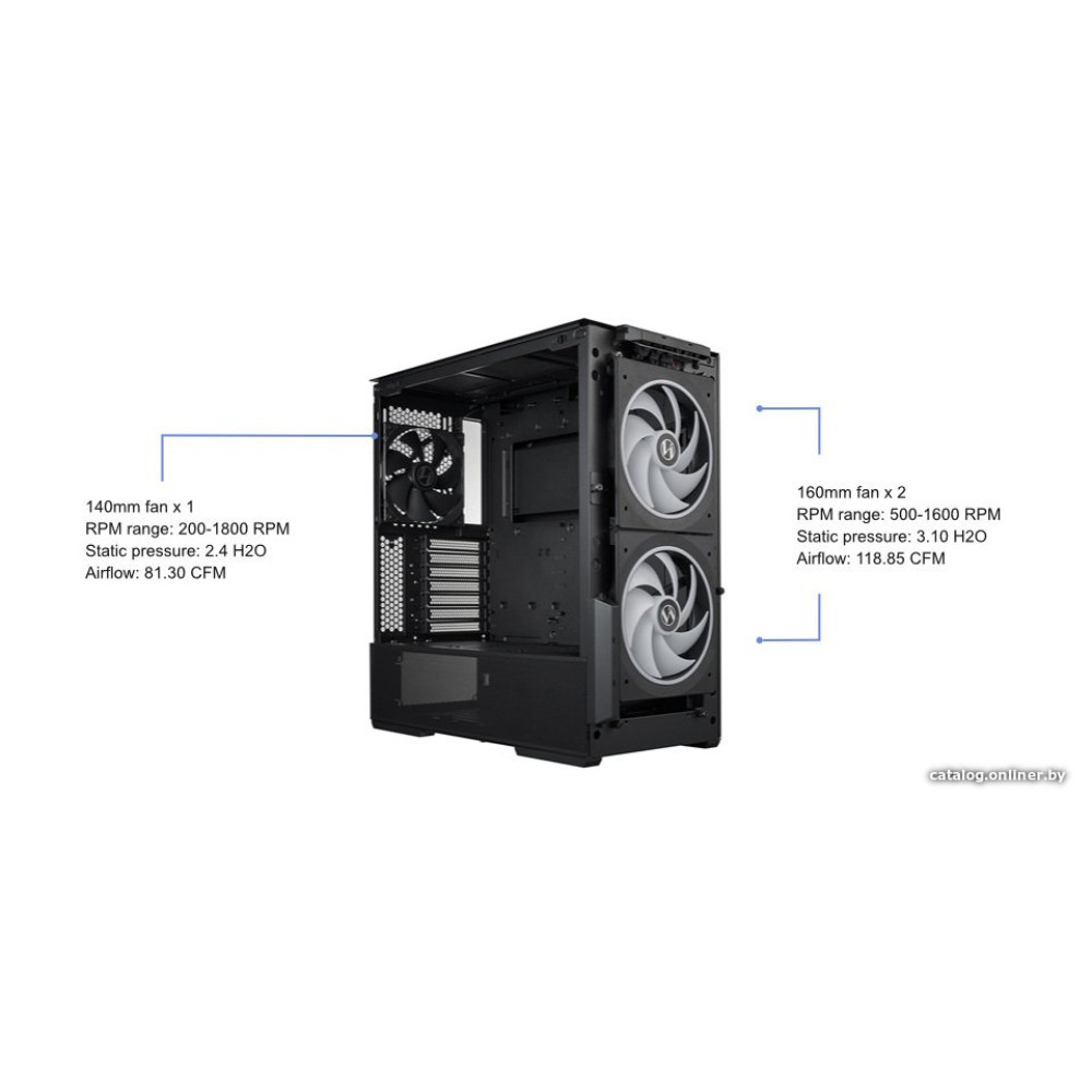 - Расположение вентиляторовспереди: 3 x 120mm / 2 x 140mm / 2 x 160mm сверху: 3 x 120mm / 2 x 140mm снизу: 2 x 120mm / 2 x 140mm сзади: 1 x 120mm / 1 x 140mm кронштейн вентилятора PCIe: 1 х 120mm В комплекте: спереди: 2 x 160mm PWM сзади: 1 x 140mm PWM
