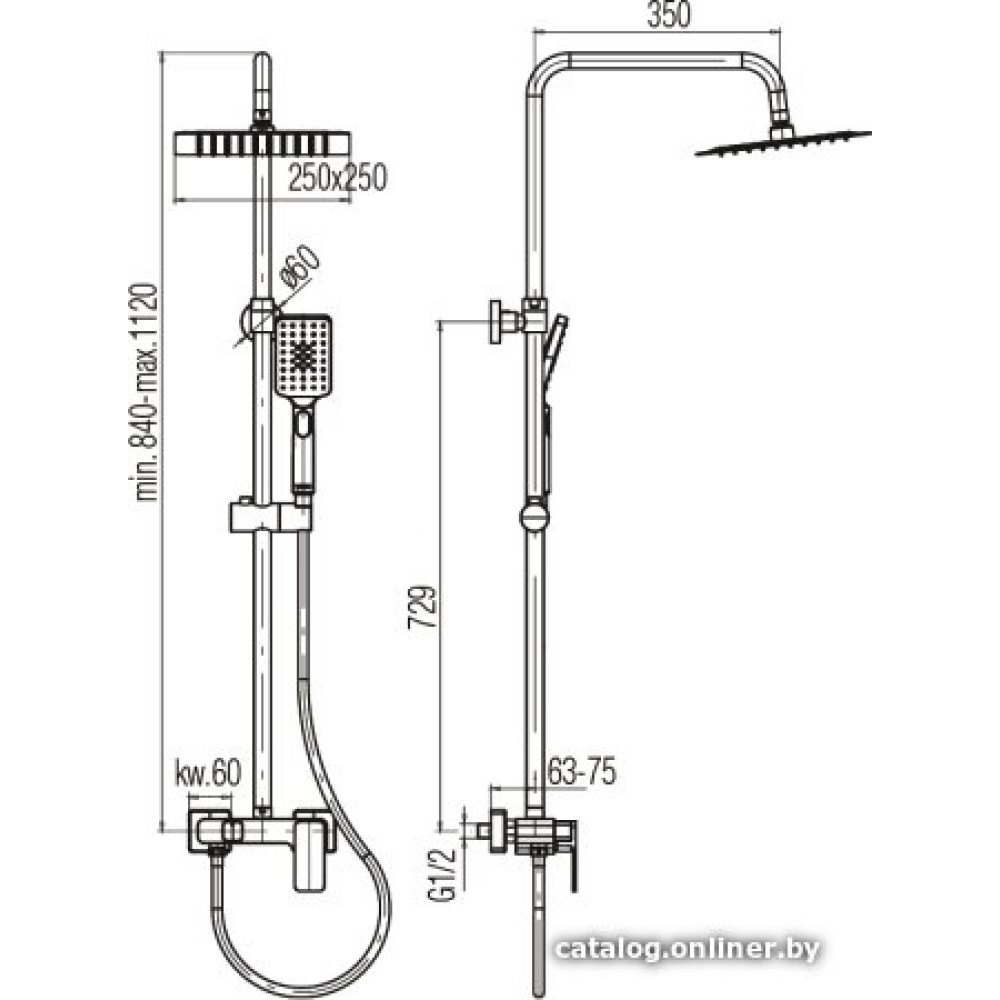 - Диаметр (ширина) верхнего душа250 мм