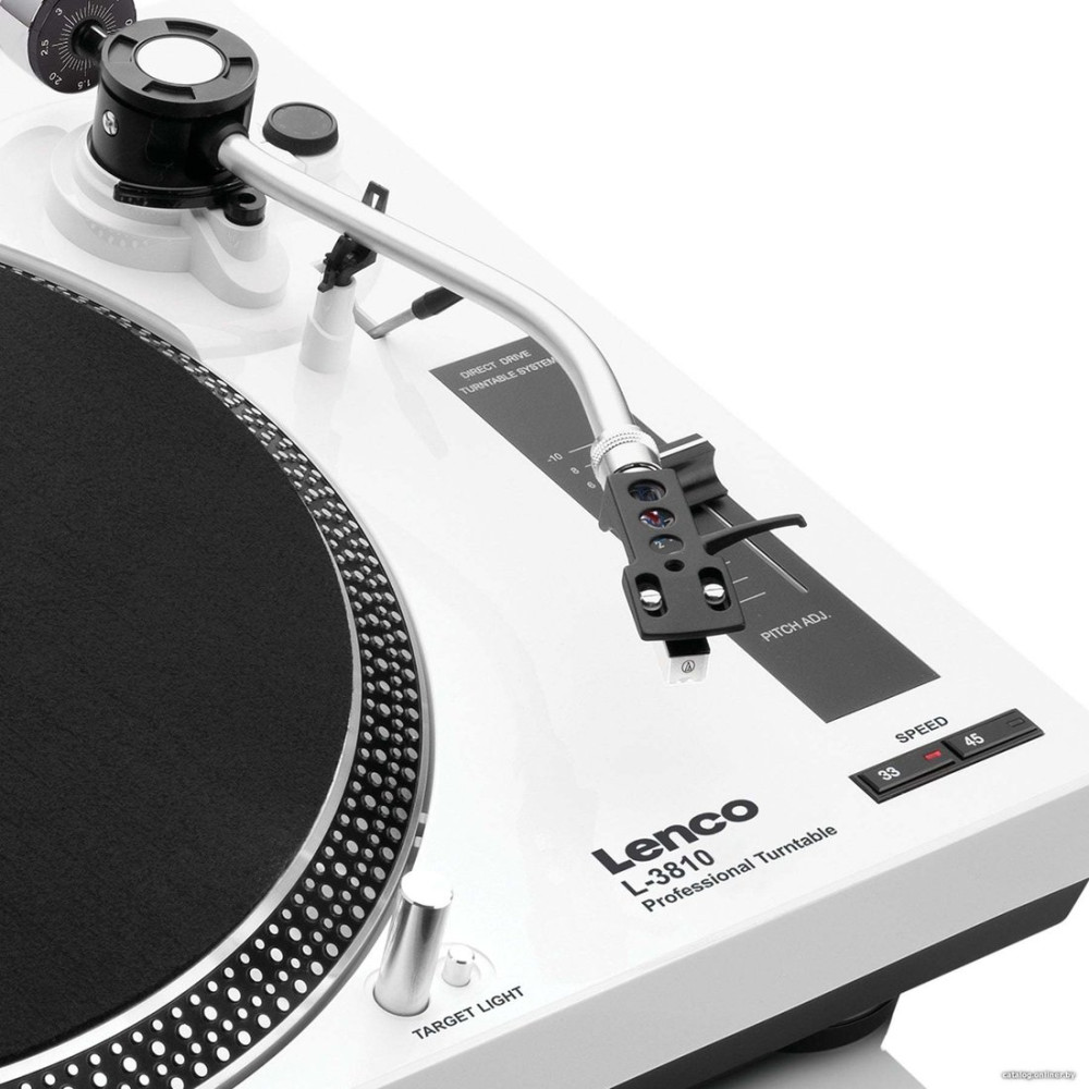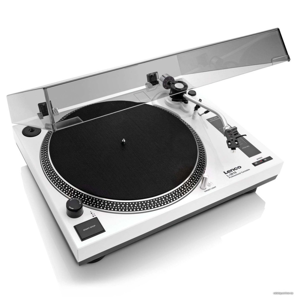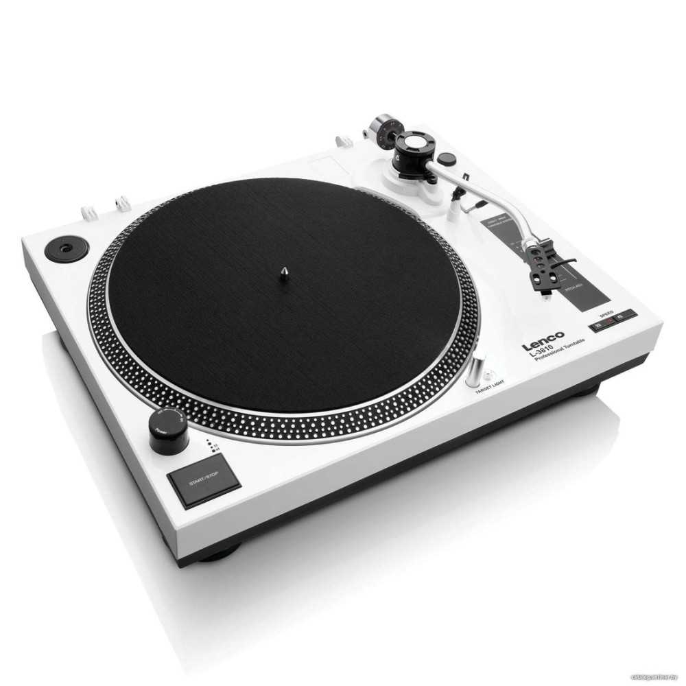 прямой привод, 33 1/3, 45 об/мин, электронное переключение скоростей, встроенный фонокорректор, тонарм поворотный (изогнутый), картридж с подвижным магнитом (MM), цвет белый