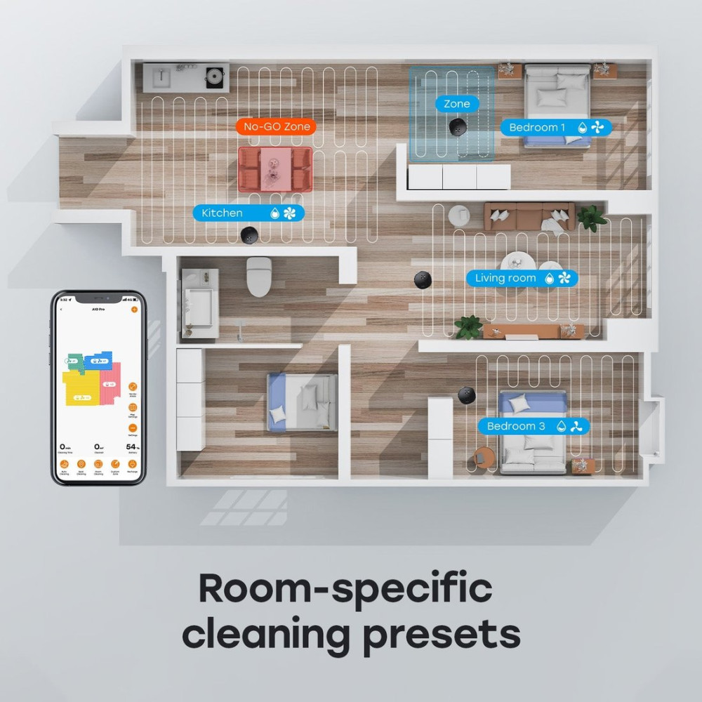 - Функциональные особенности пылесосалокальная уборка, уборка по расписанию, виртуальная стена в приложении, определение ковров