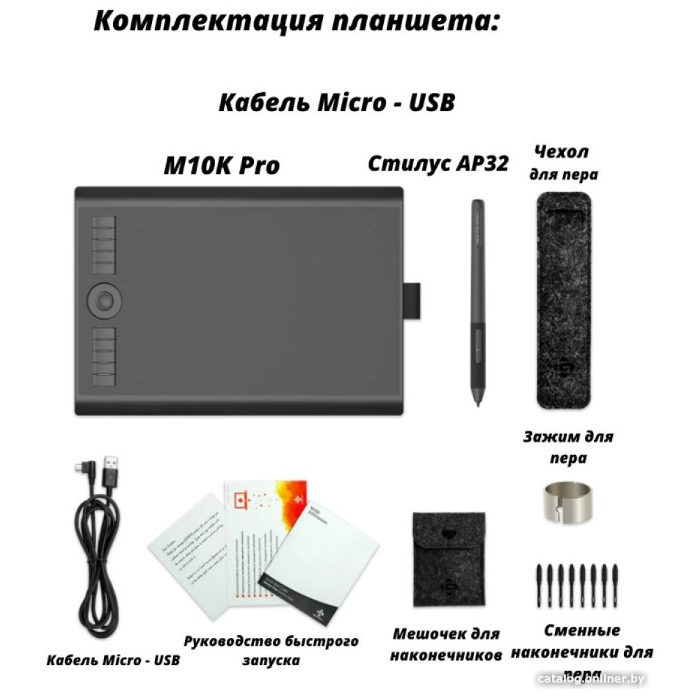- Комплект поставки- графический планшет - стилус Gaomon AP32 - сменные наконечники (8 шт.) - зажим для стилуса - пенал для стилуса - кабель microUSB - USB Type-A - OTG-адаптер на USB Type-C - OTG-адаптер на microUSB - чехол для адаптеров - документация