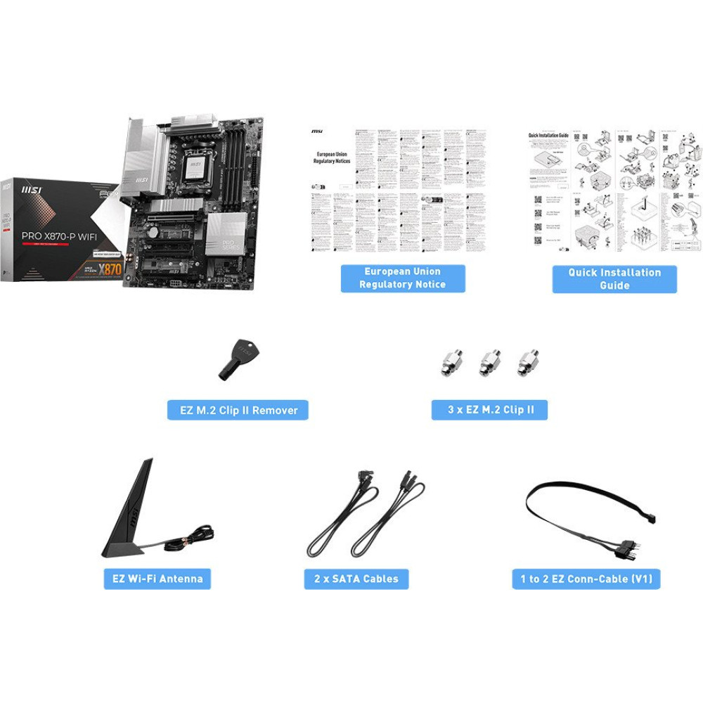 • КомплектацияBoard • 1x Motherboard Documentation • 1x Quick installation guide • 1x European Union Regulatory Notices Cables • 2x SATA 6Gb/s cables • 1x 1 to 2 EZ Conn-Cable (V1) Accessories • 1x EZ Wi-Fi antenna • 3x EZ M.2 Clip II • 1x EZ M.2 Clip II Remover