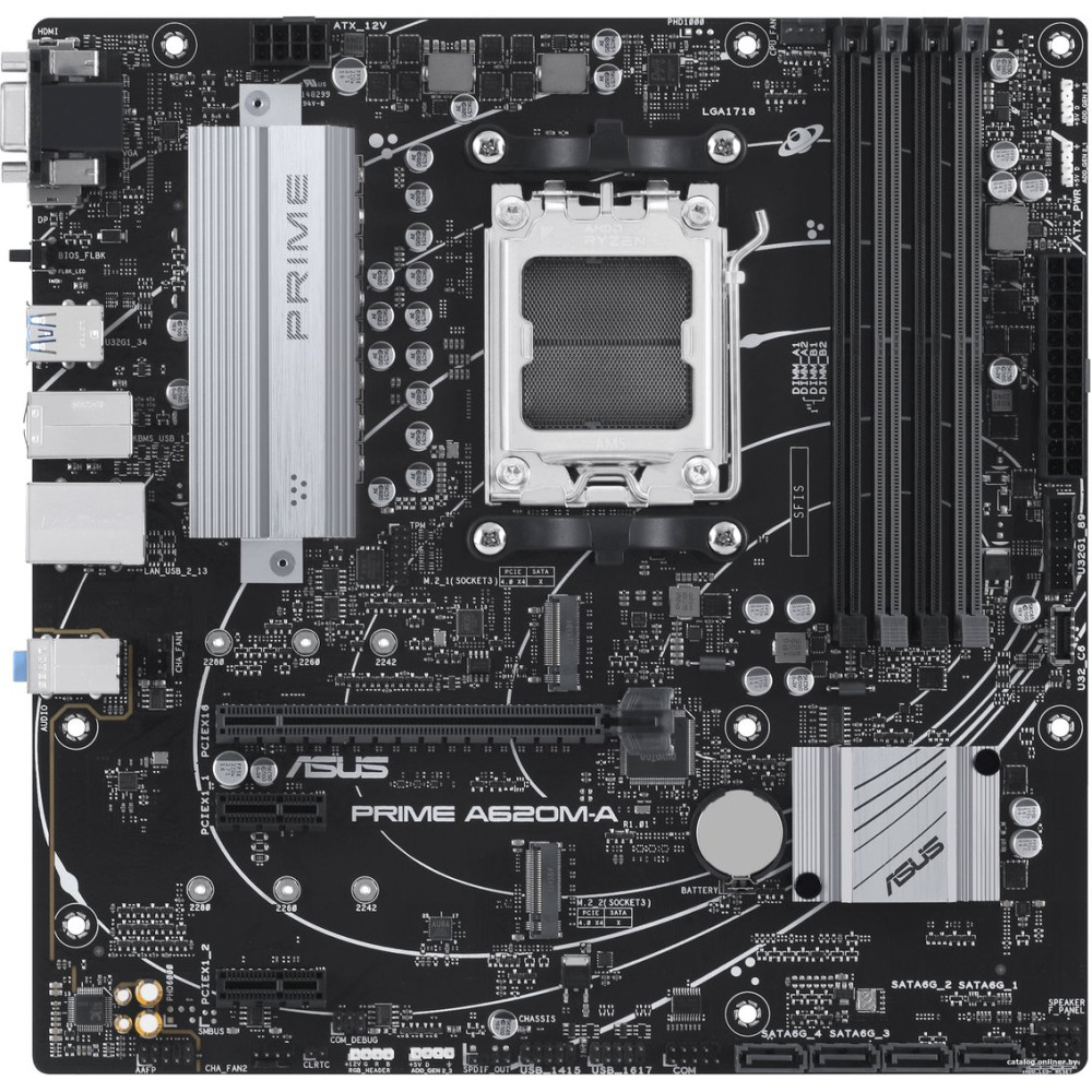 mATX, сокет AMD AM5, чипсет AMD A620, память 4xDDR5, слоты: 1xPCIe x16 4.0, 2xM.2