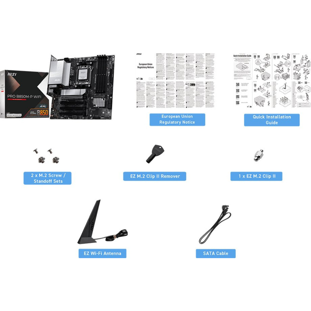 • Комплектация - 2 винта для M.2 - EZ M.2 Clip II экстрактор - винт EZ M.2 Clip II - кабель SATA - EZ Wi-Fi антенна - документация