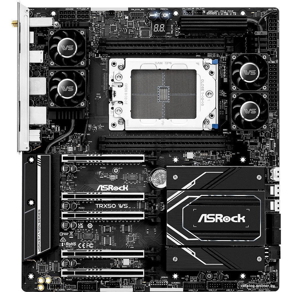eATX, сокет AMD TR5, чипсет AMD TRX50, память 4xDDR5, слоты: 5xPCIe x16 5.0, 2xM.2, 802.11ax (Wi-Fi 6E)+Bluetooth 5.2, 18+3+3 фаз питания