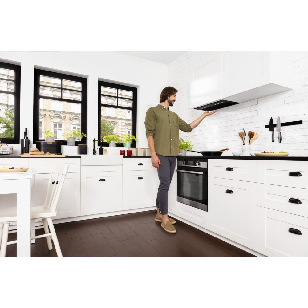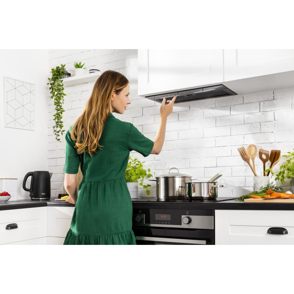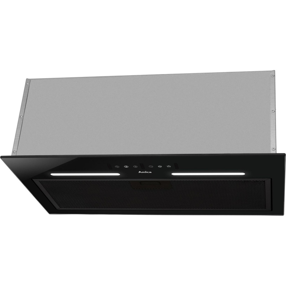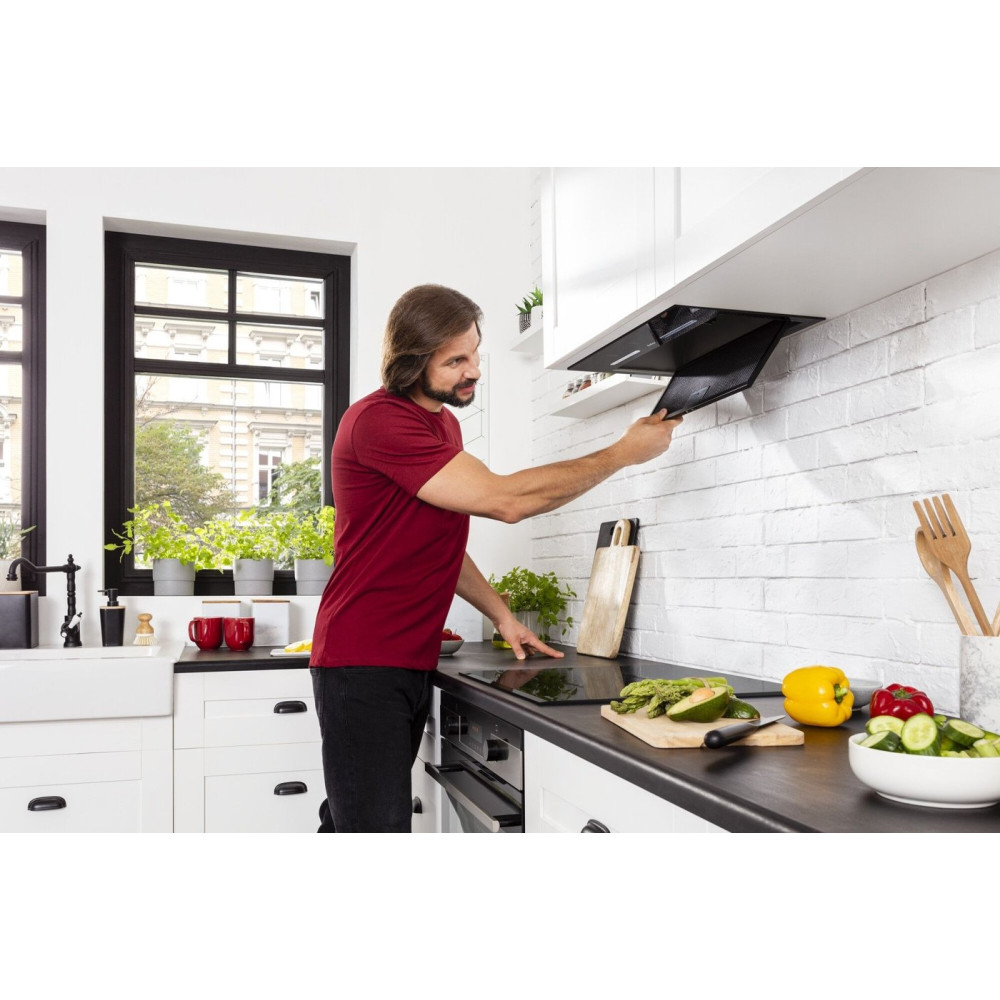 конструкция скрытая, монтаж для встраивания, ширина 55 см, управление сенсорное/жестами, производительность вытяжки 508 м³/ч, цвет черный
