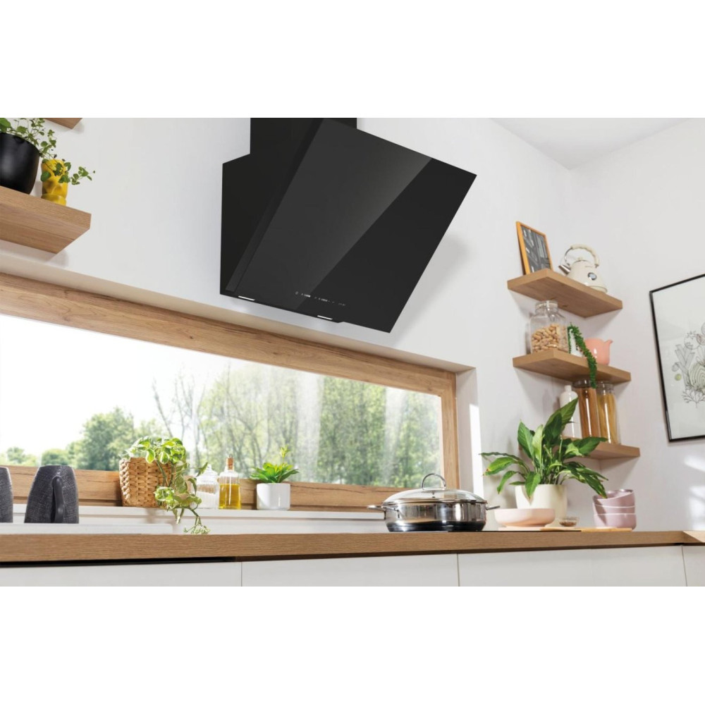 конструкция наклонная, монтаж настенный, ширина 60 см, управление сенсорное, производительность вытяжки 740 м³/ч, цвет черный