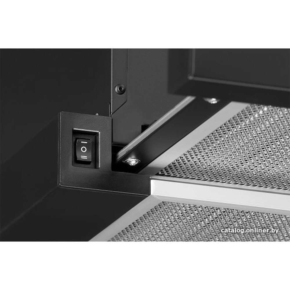 конструкция телескопическая, монтаж для встраивания, ширина 49.5 см, управление механическое, производительность вытяжки 300 м³/ч, цвет черный