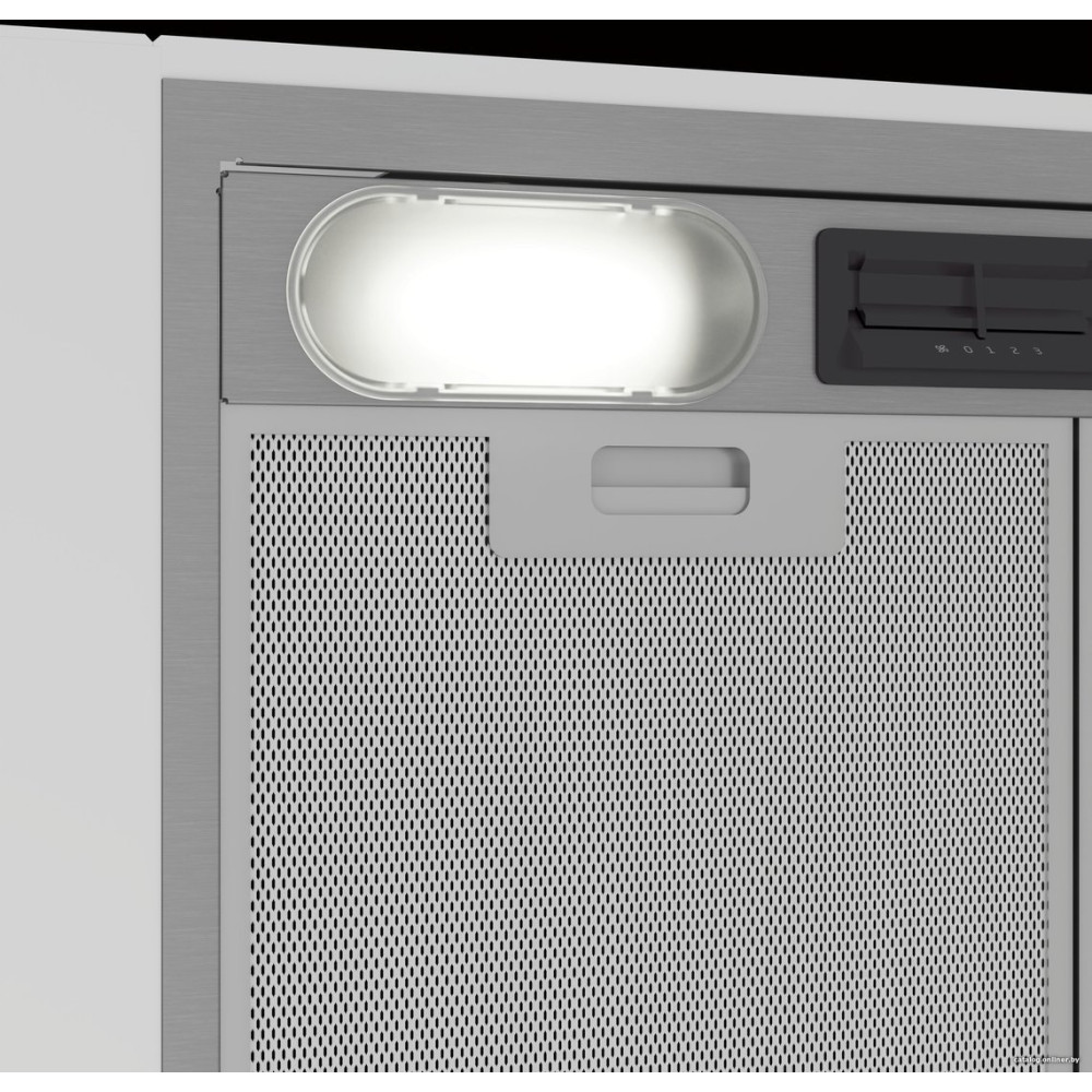 конструкция скрытая, монтаж для встраивания, ширина 53 см, управление механическое/слайдерное, производительность вытяжки 381 м³/ч, цвет серебристый