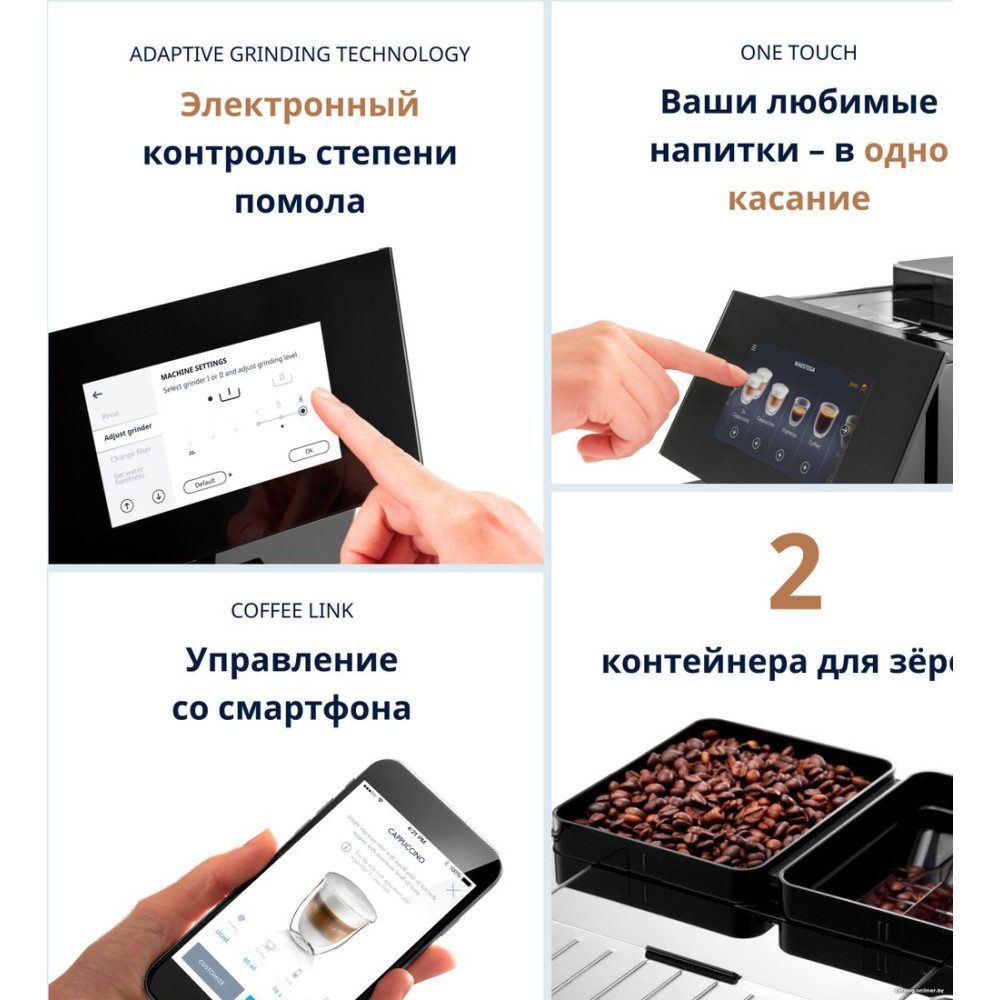 • Программы приготовленияэспрессо, лунго, американо, капучино, латте макиато, эспрессо макиато, флэт уайт, латте, доппио, лонг блэк, горячее молоко, горячий шоколад, кофе в кофейник, холодный кофе