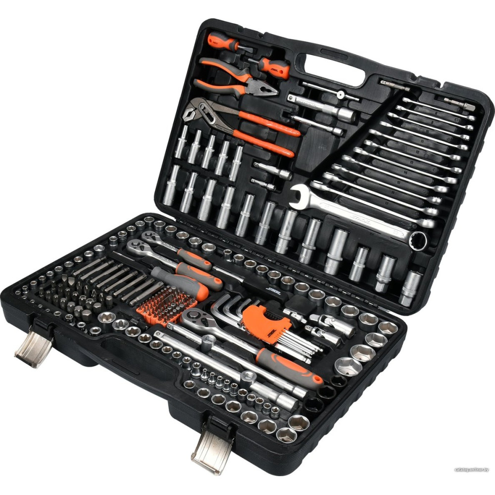 - КомплектацияТорцевые головки 1/2": (10; 13; 15; 16; 17; 18; 19; 20; 21; 22; 23; 24мм. (длиной 38мм.), 27; 30; 32мм. (длиной 42мм.)) Торцевые головки 3/8": (10; 11; 12; 13; 14; 15; 16мм (длиной 28мм.), 17; 18; 19мм. (длиной 30 мм.)) Торцевые головки 1/4" : (3.5; 4; 4.5; 5; 5.5; 6; 7; 8; 9; 10; 11; 12; 13; 14мм. (длиной 25мм.)) Торцевые головки 1/2" Е-тип : 5 предмет(ов) (E16; E18; E20; E22; E24) Торцевые головки 3/8" Е-тип : 4 предмет(ов) (E10; E11; E12; E14) Торцевые головки 1/4" Е-тип : 4 предмет(ов) (E4; E5; E6; E7; E8) Трещотка : (1/2", 3/8", 1/4") Т-образный вороток : 1/4" Кардан : 1/2", 3/8", 1/4" Удлинители 1/2" : 2 предмет(ов) (125 и 250мм) Удлинители 3/8" : 2 предмет(ов) (75 и 250мм) Удлинители 1/4" : 2 предмет(ов) (50 и 100мм) Головки свечные 1/2" : 3 предмет(ов) (17; 19; 20.6мм) Переходник Комбинированные ключи : (8; 9; 10; 11; 12; 13; 14; 15; 16; 17; 19; 22мм) Шестигранные ключи : (2; 2.5; 3; 4; 5; 6; 7; 8; 10; 12мм) Пассатижи Клещи переставные Отвертки Биты (насадки-отвертки): 88