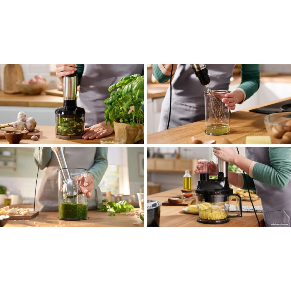 - Комплектация Блендер из нержавеющей стали с ножем QuattroBlade Измельчитель для специй, орехов, сыра, мяса и многого другого (полезный объем 500 мл) Венчик из нержавеющей стали для взбивания сливок или яичного белка Мерный стакан в комплекте Кухонный комбайн с насадкой для измельчения, нарезки, шинковки, замешивания и нарезки кубиками (полезный объем 1,25 л, размер кубика: 9 x 9 мм)