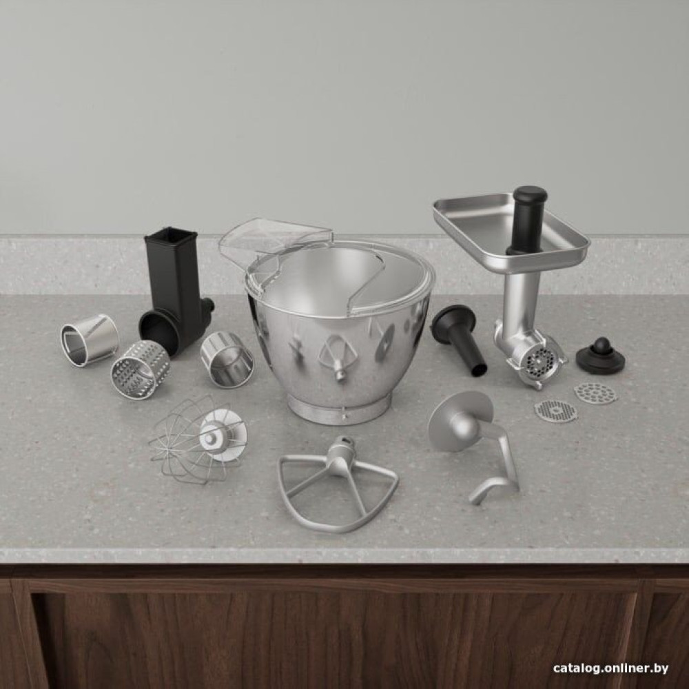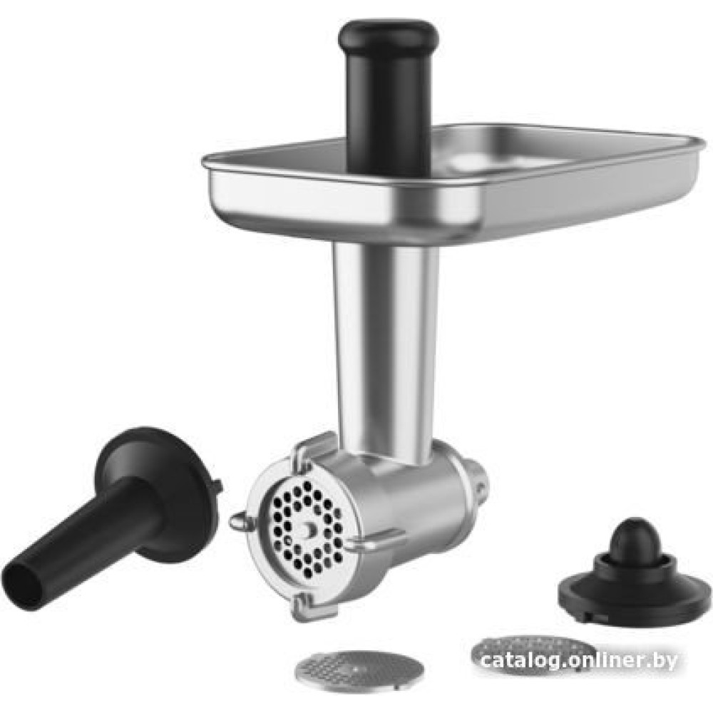 - Полная комплектациякухонная машина металлическая чаша венчик крюк для теста насадка для смешивания защитная крышка от брызг мясорубка с решетками с мелкой, средней и крйпной перфорацией, с насадкой для приготовления кеббе, с насадкой для приготовления колбас