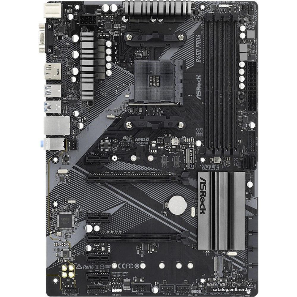 ATX, сокет AMD AM4, чипсет AMD B450, память 4xDDR4, слоты: 2xPCIe x16 3.0, 2xM.2