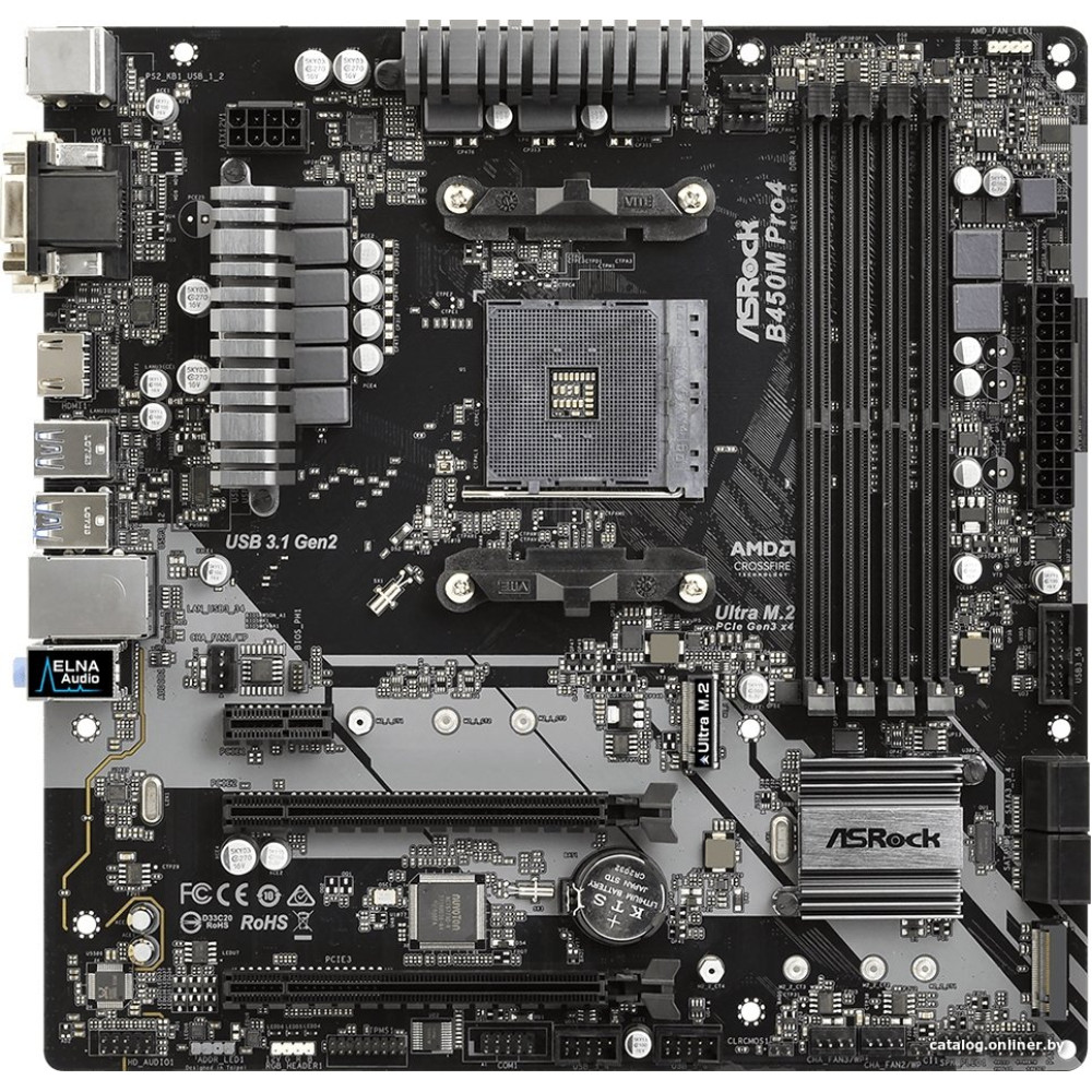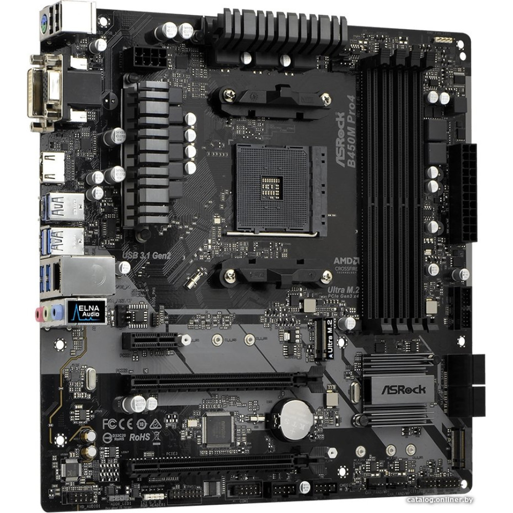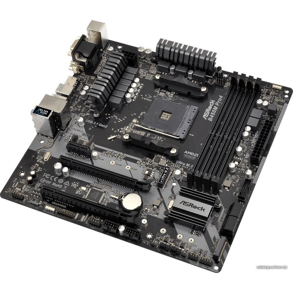 mATX, сокет AMD AM4, чипсет AMD B450, память 4xDDR4, слоты: 2xPCIe x16 3.0, 2xM.2