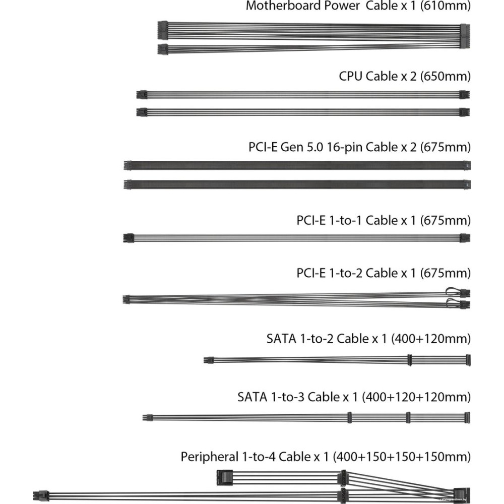 • Комплектация Power Cord x 1 Motherboard Power Cable x 1 (610mm) CPU Cable x 2 (650mm) PCI-E Gen 5 16-pin Cable x 2 (675mm) PCI-E (16-pin to 8-pin-8-pin) Cable x 1 (675mm) PCI-E 1-to-1 Cable x 1 (675mm) SATA 1-to-2 Cable x 1 (400+120mm) SATA 1-to-3 Cable x 1 (400+120+120mm) Peripheral 1-to-4 Cable x 1 (400+150+150+150mm) TUF Gaming Cable Tie x 3 User Manual x 1