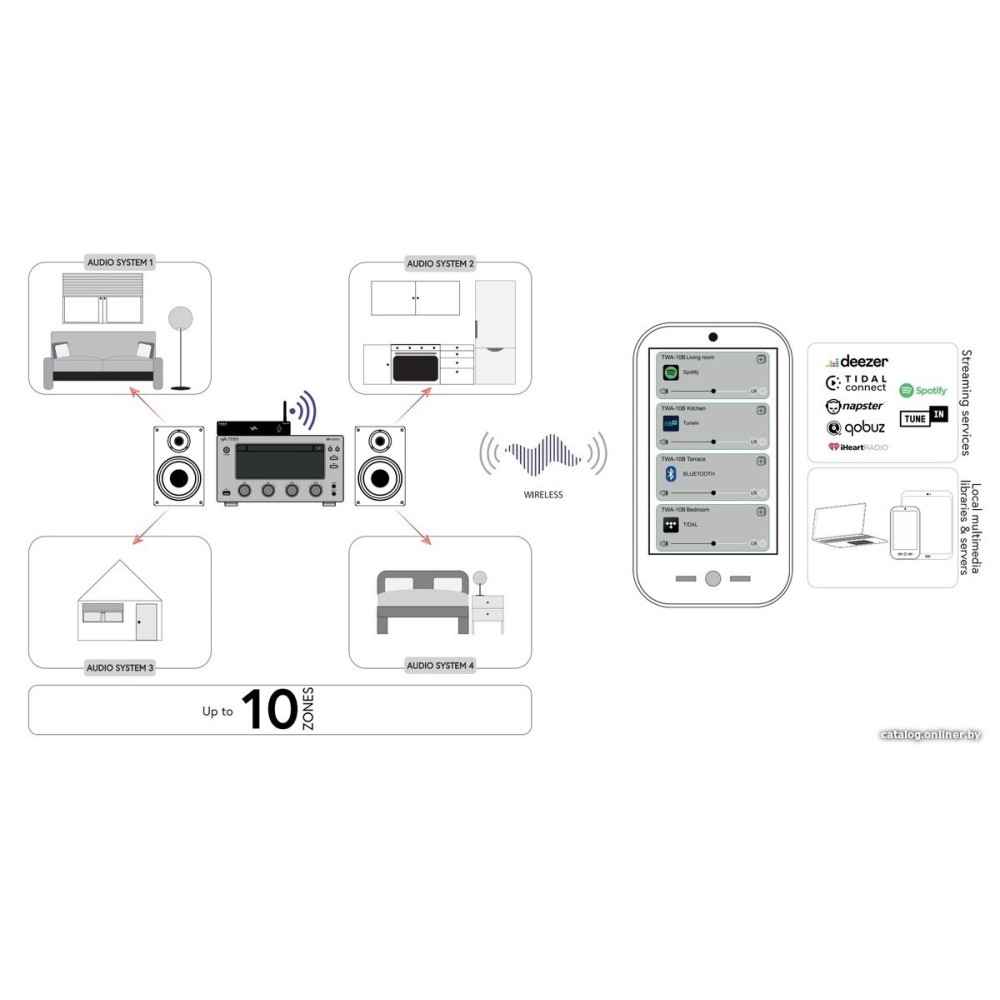 - Стриминговые сервисыDeezer, iHeartRadio, Napster, Qobuz, Spotify, Tidal, TuneIn