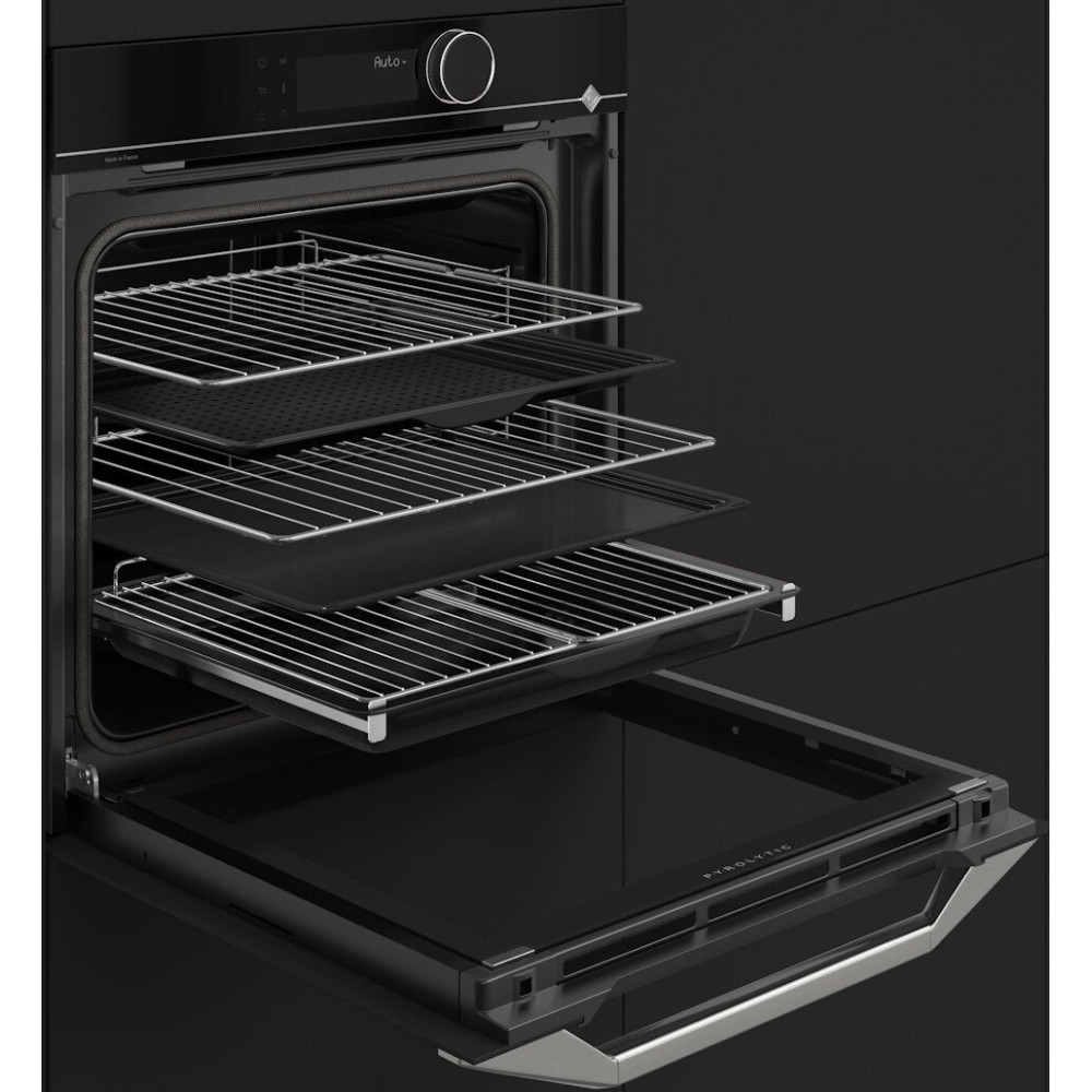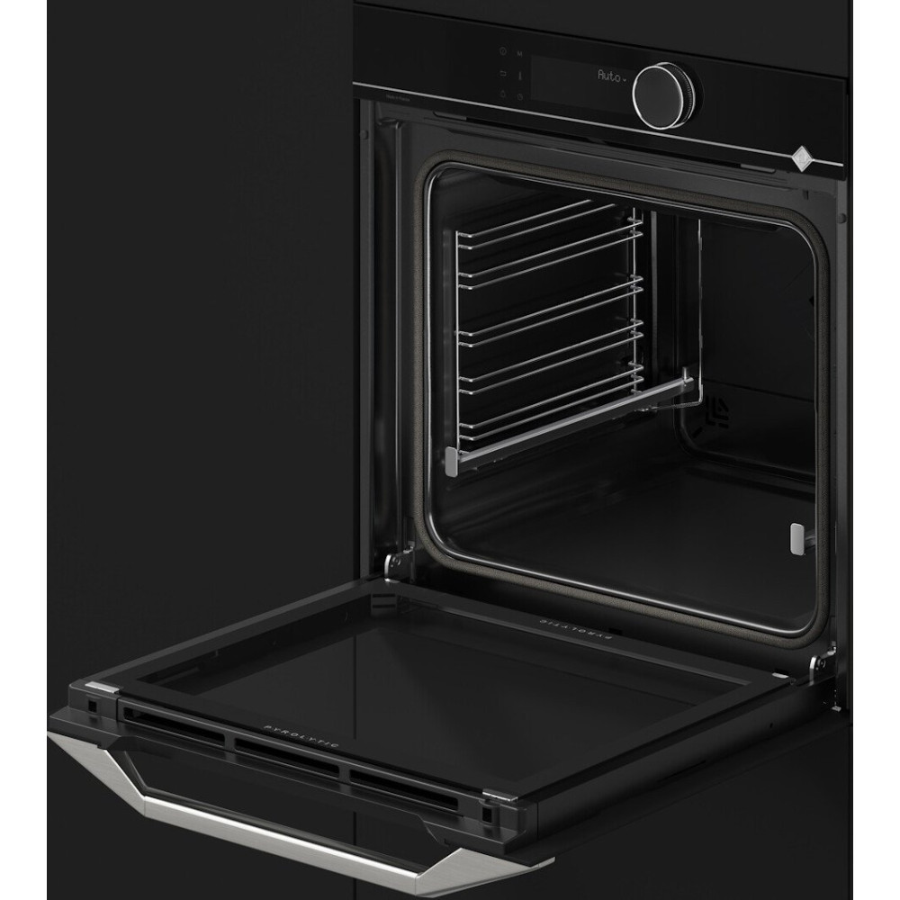 электрический с конвекцией, объем 73 л, 13 режимов, автопрограммы, очистка пиролитическая, 2 стекла в дверце, направляющие проволочные + телескопические (1 уровень), термощуп