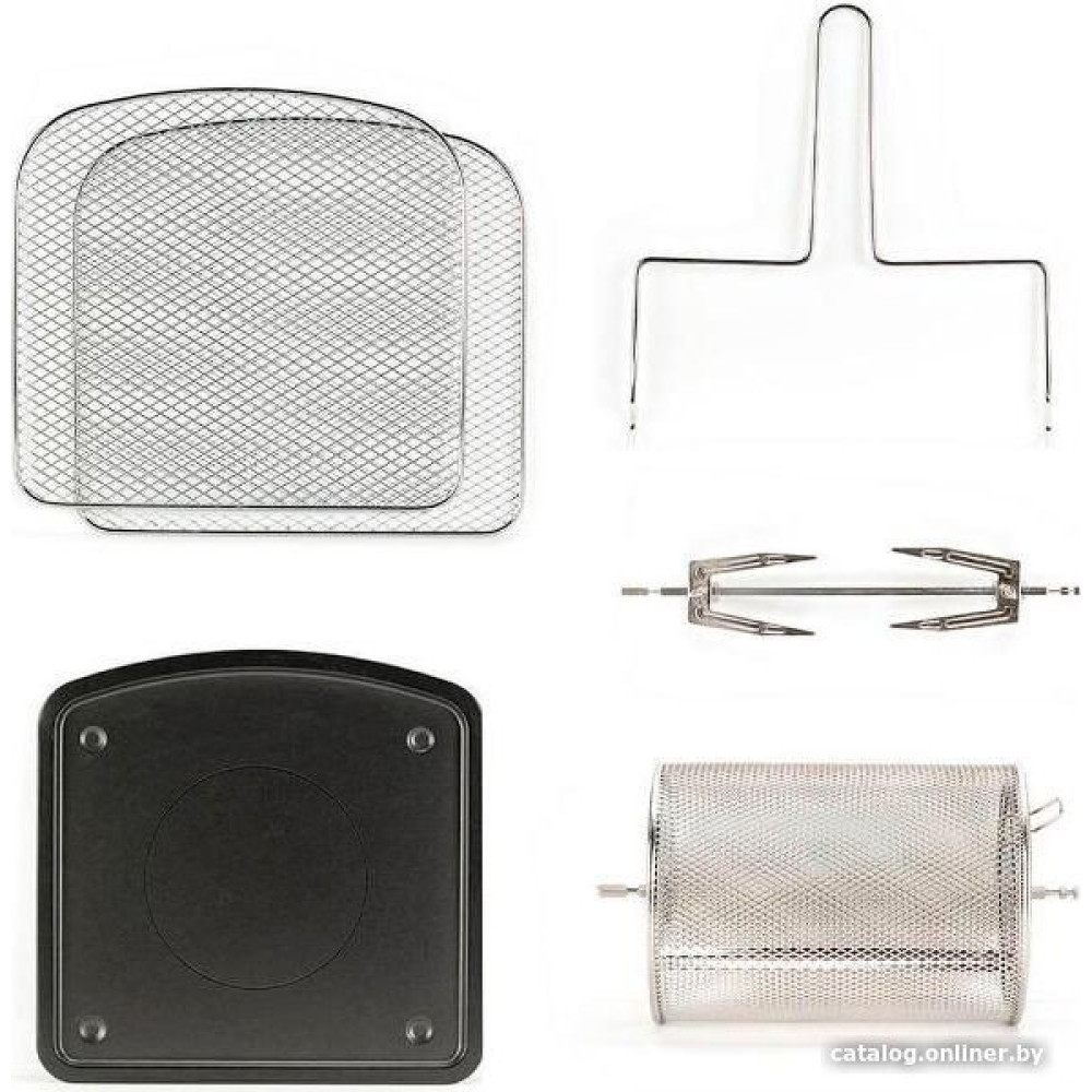 • Комплект поставки две решетки для духовки, корзина для жарки, противень и вращающийся вертел для запекания.