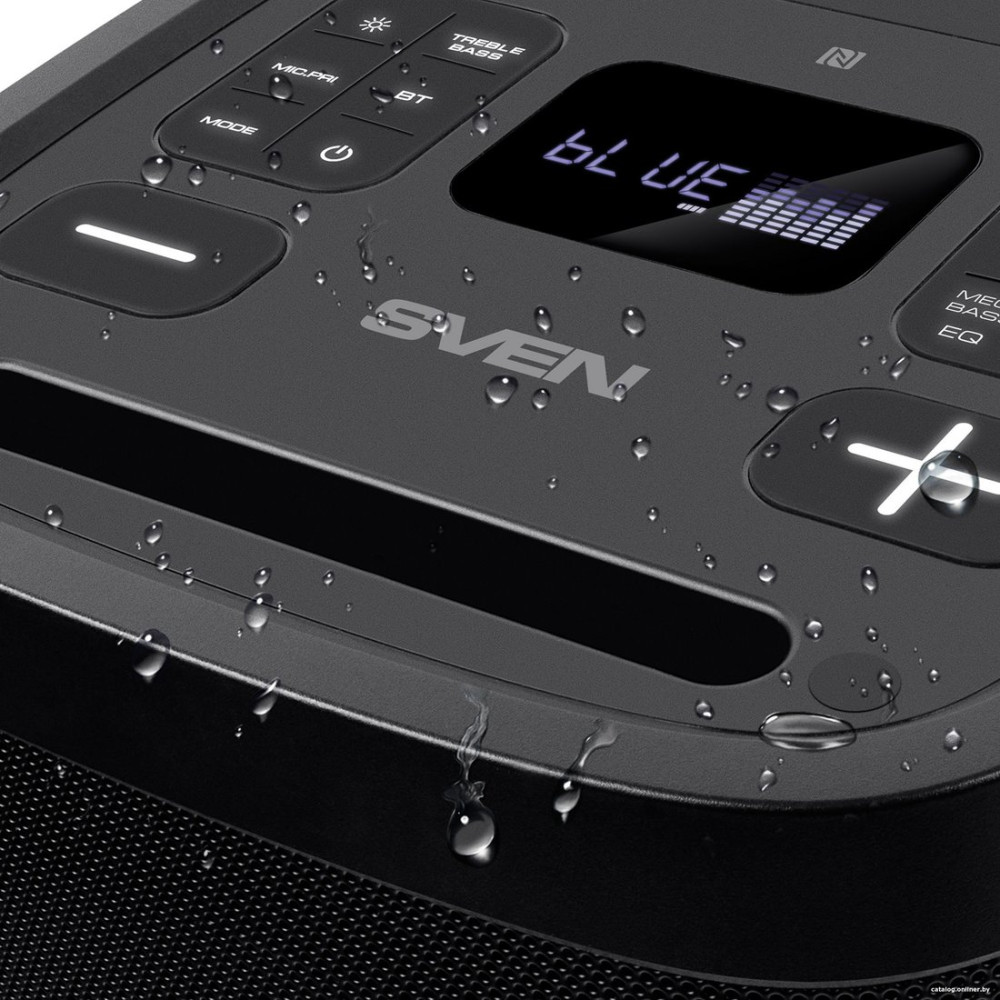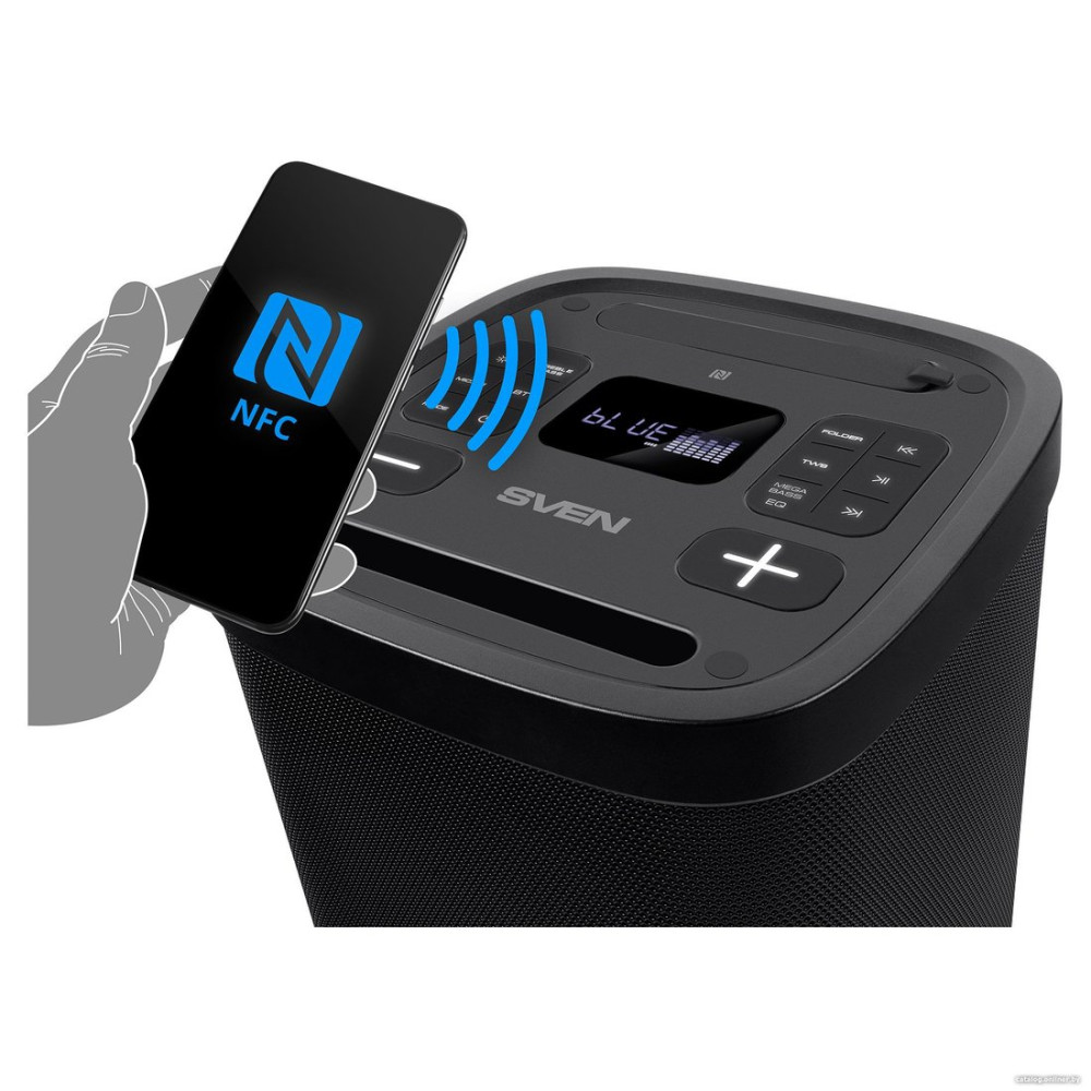 номинальная мощность 160 Вт, воспроизведение с USB/microSD, питание от аккумулятора, BT, NFC, AUX, влагозащита IPX4, время работы: 22 ч.
