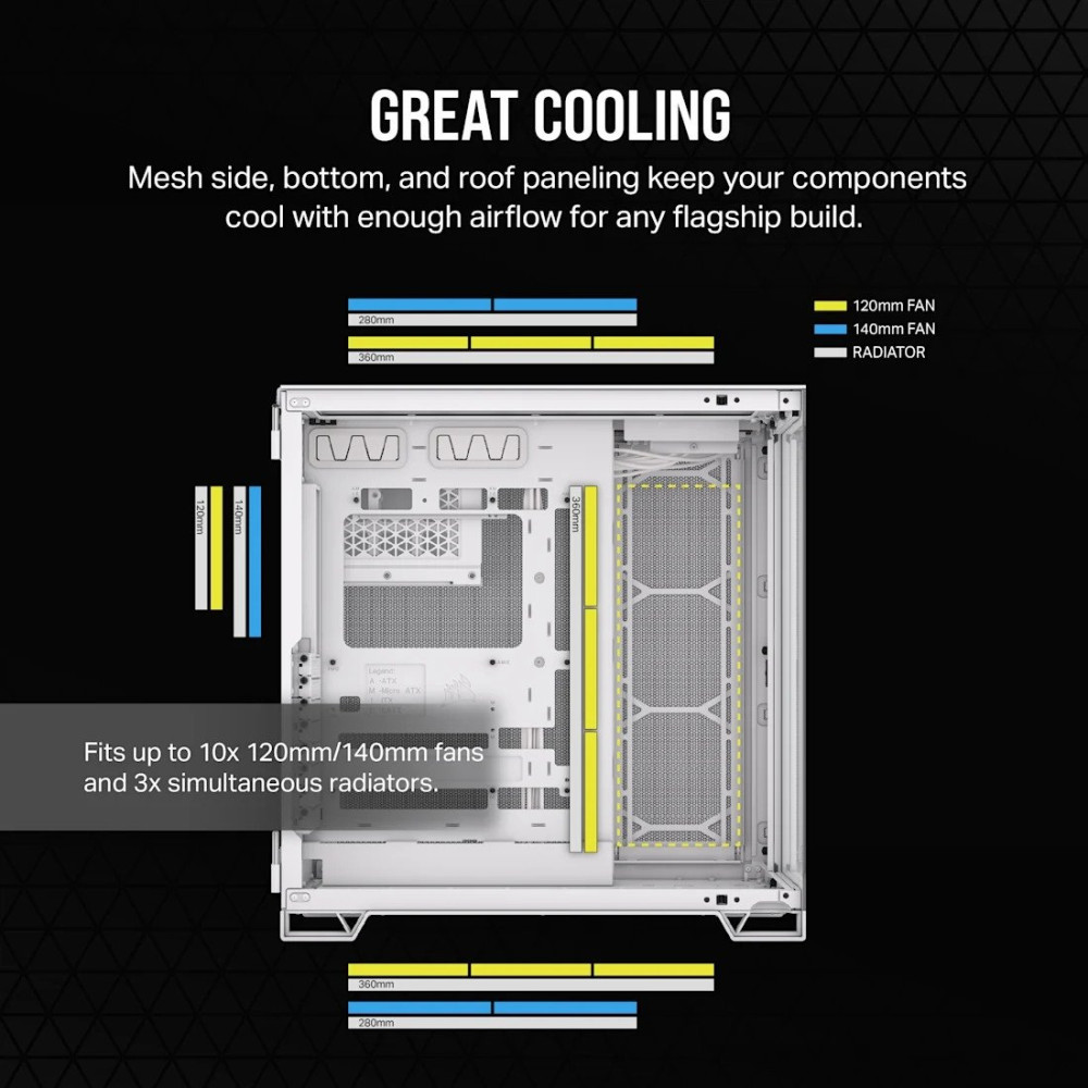 - Расположение вентиляторовсверху: 3x 120mm, 3x 140mm снизу: 3x 120mm, 3x 140mm сбоку: 3x 120mm сзади: 1x 120mm, 1x 140mm