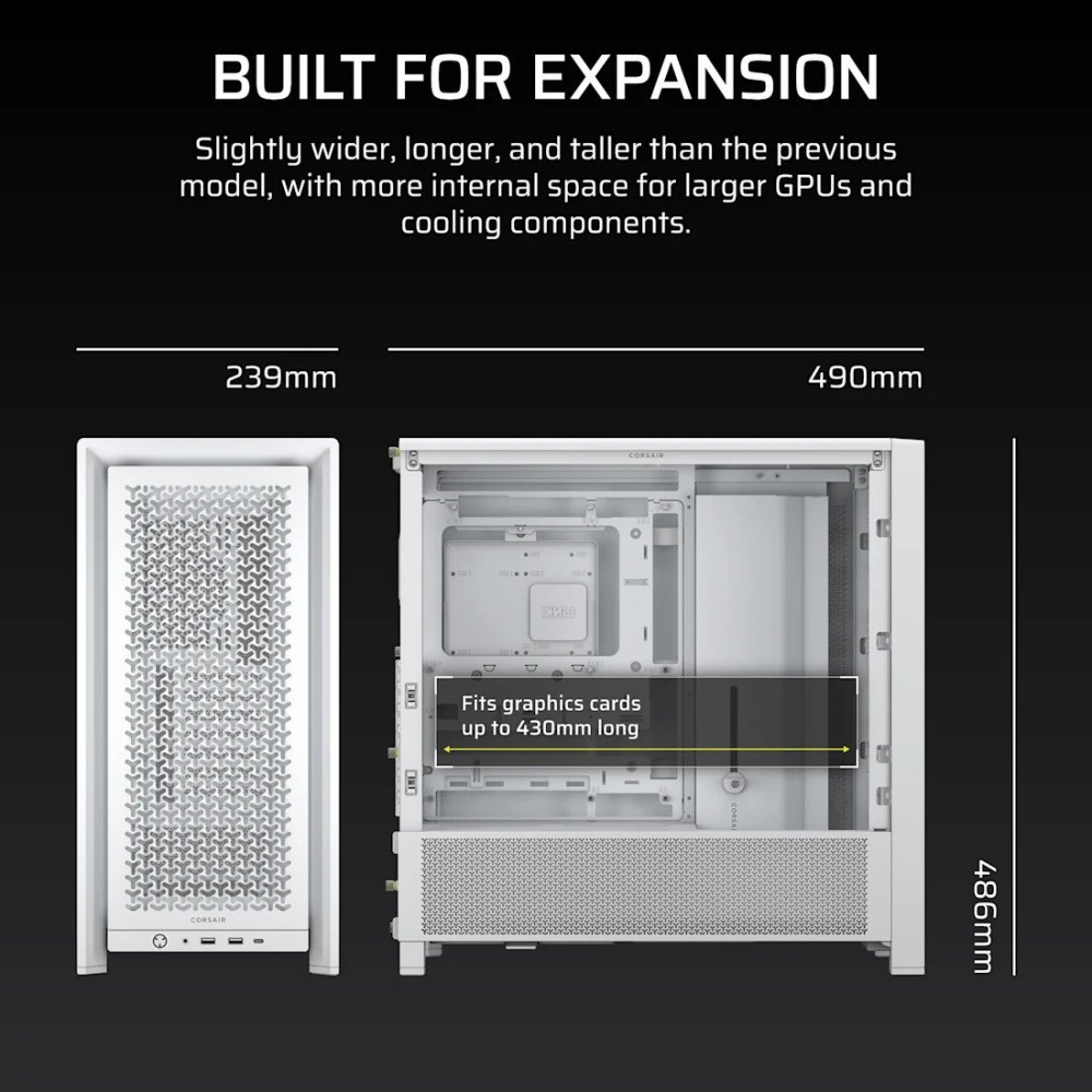 Mid Tower, БП отсутствует, для плат ATX/micro-ATX/mini-ITX/eATX, без вентиляторов в комплекте, окно: закаленное стекло, видеокарта до 430 мм, охлаждение ЦП до 170 мм, 2xUSB-A 3.2 5Гбит/с, 1xUSB-C 3.2 10Гбит/с, цвет белый