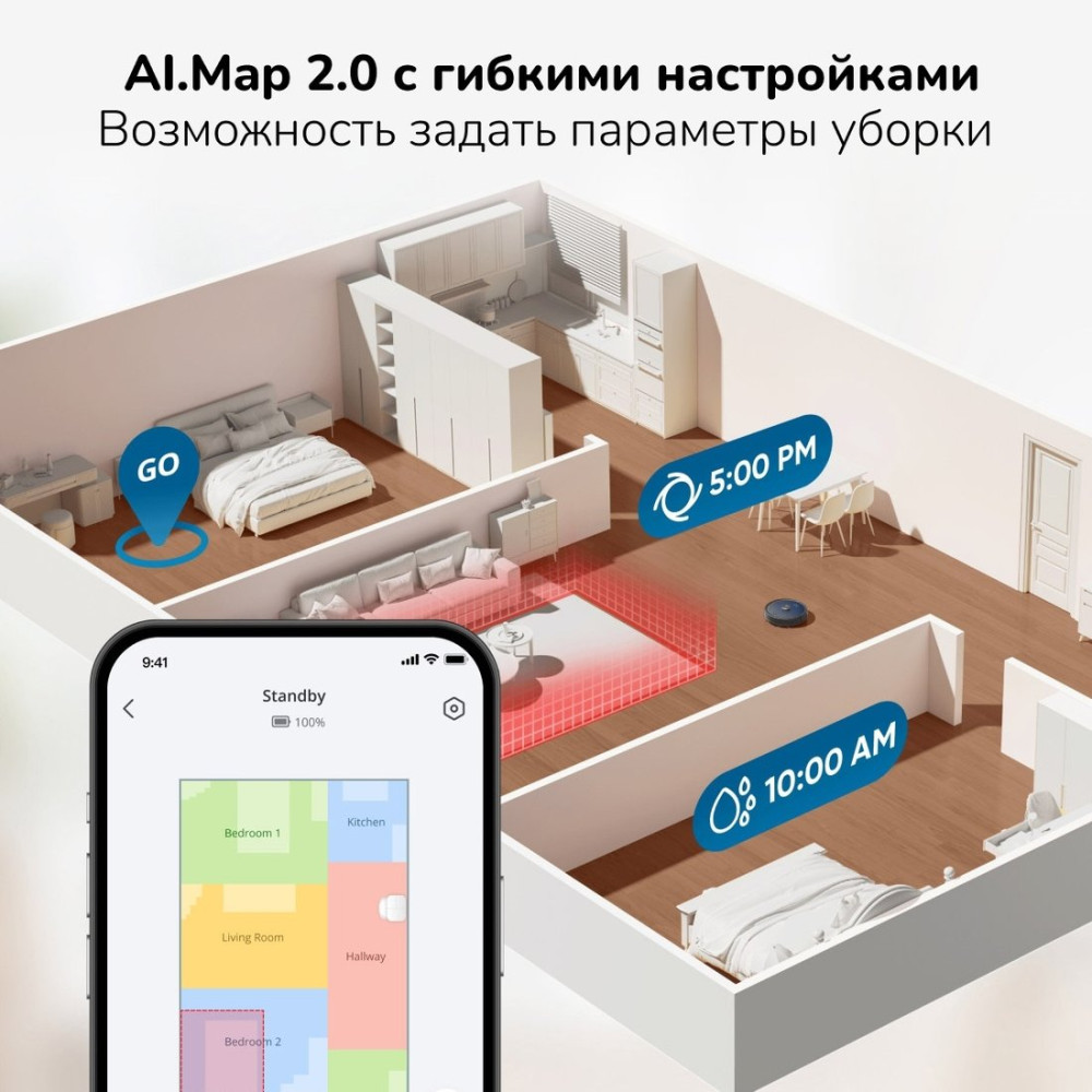 - Функциональные особенности пылесосалокальная уборка, уборка по расписанию, виртуальная стена в приложении, определение ковров