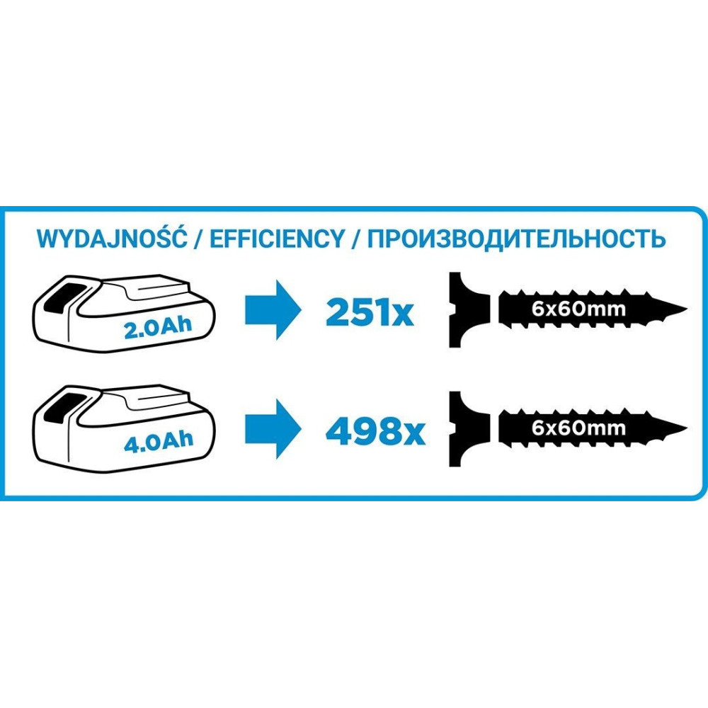 • Комплектация - дрель-шуруповерт - 2 АКБ 2 Ач - з/у - кейс
