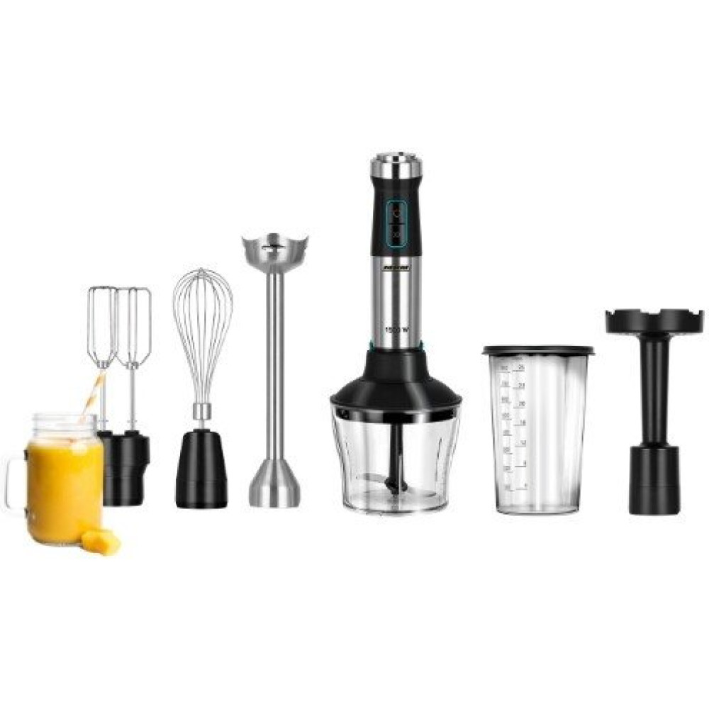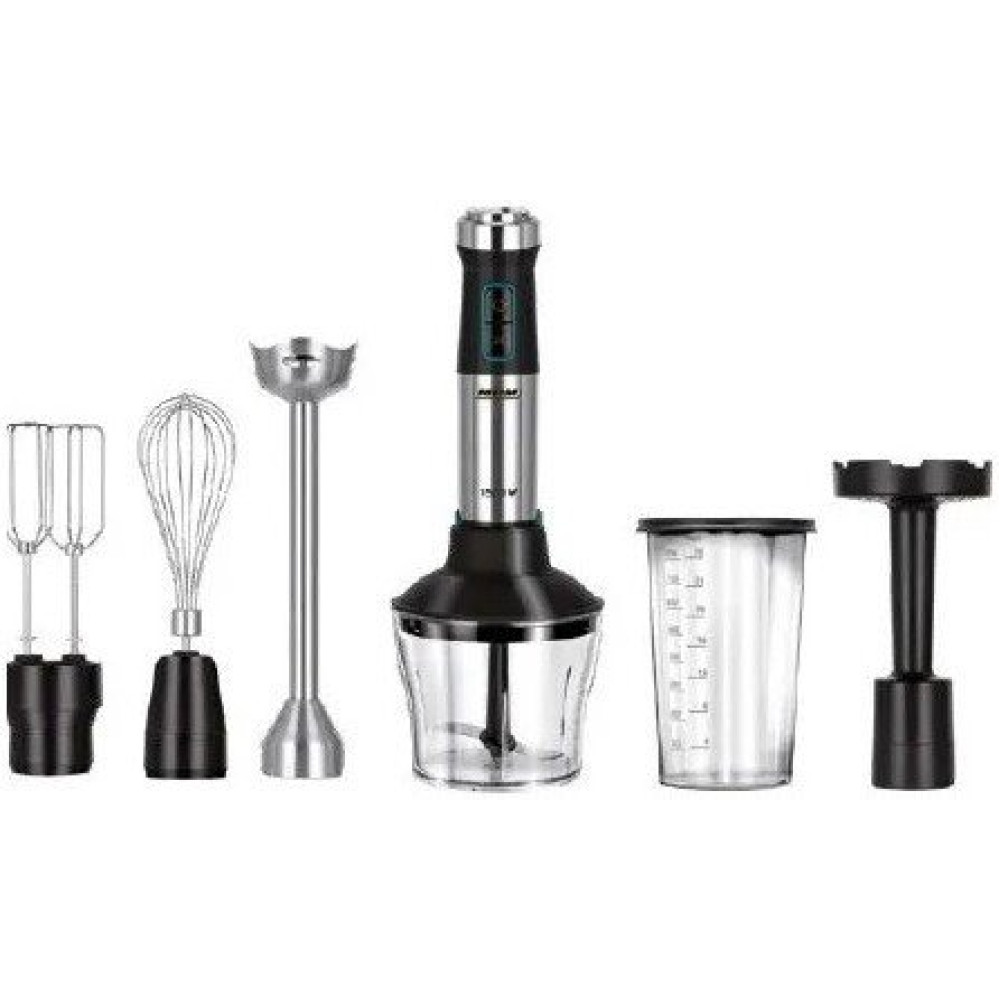 • Комплектация погружная ножка XL из нержавеющей стали, насадка для пюре, венчик для взбивания, измельчитель с ножом из нержавеющей стали (600 мл), мерный стакан с крышкой (800 мл), насадка-миксер, руководство пользователя