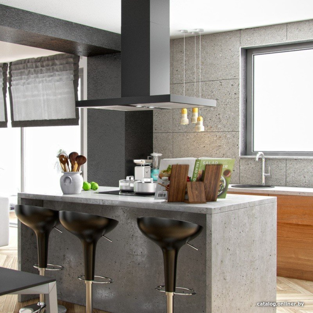 конструкция Т-образная, монтаж островной, ширина 90 см, управление электронное, производительность вытяжки 560 м³/ч, цвет черный