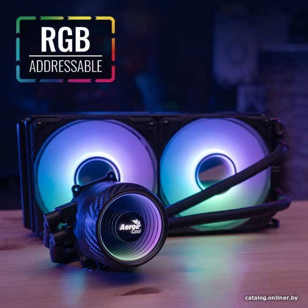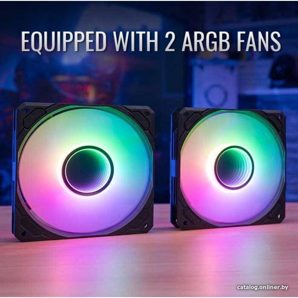 типоразмер 240, рассеивание до 400 Вт, высота 27 мм, вентилятор 120 мм, 1800 об/мин, PWM, подшипник гидродинамический (FDB), ARGB подсветка, макс. шум 26.8 дБ