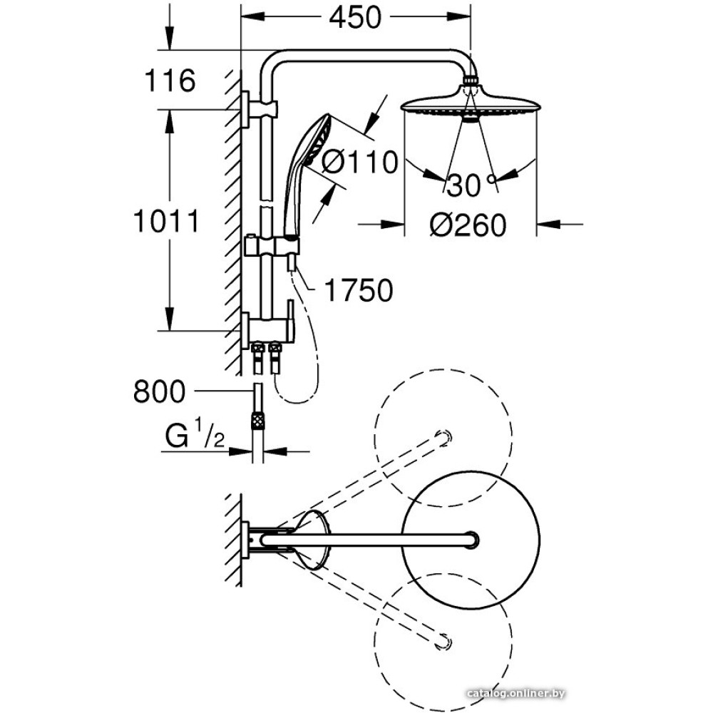 душевая система (с верхним душем), настенный монтаж, отсутствует смеситель, верхний душ 260 мм, ручной душ 110 мм