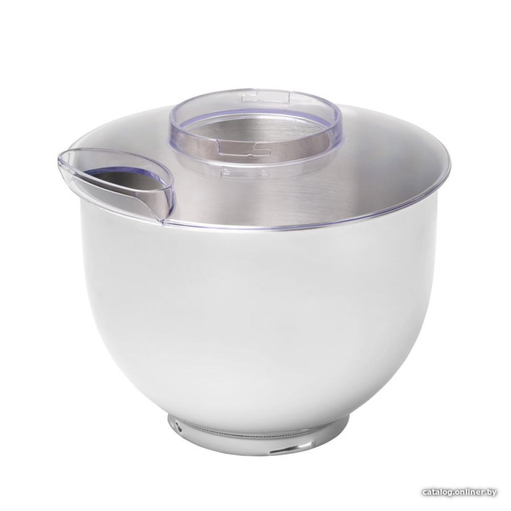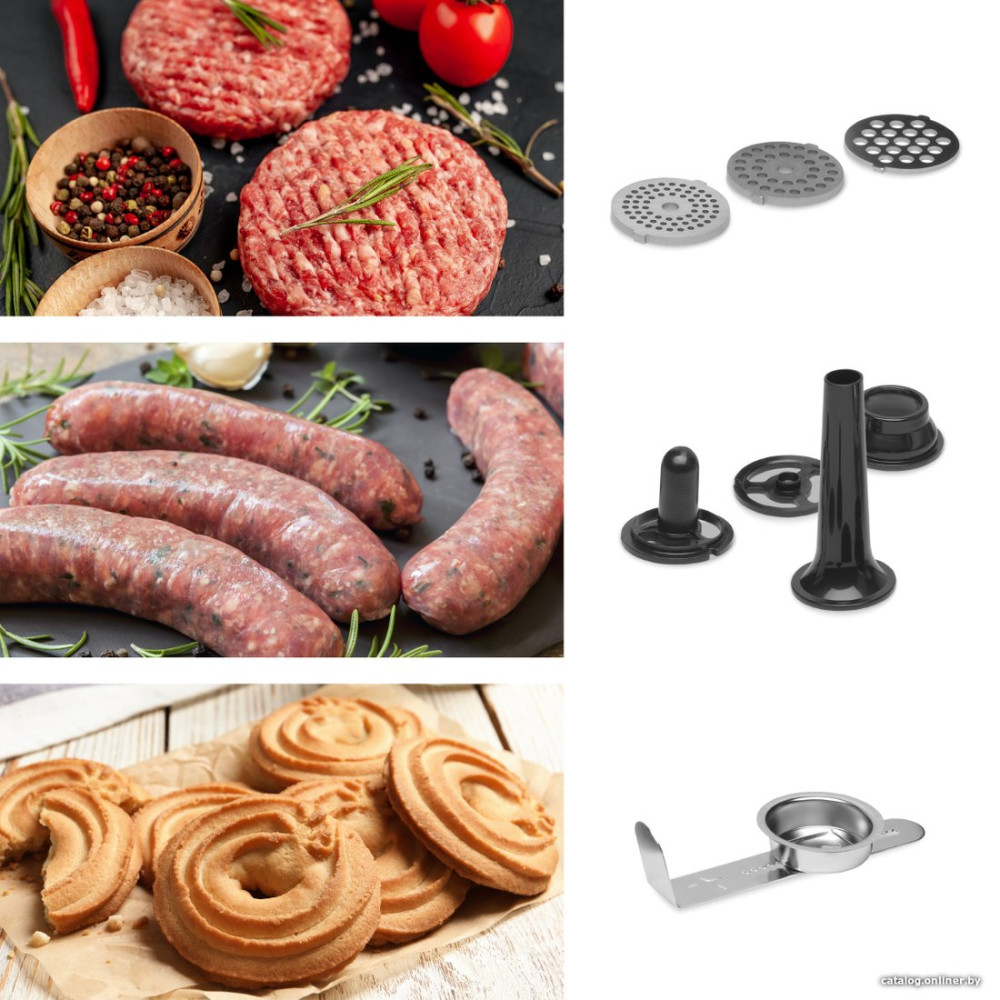 • Полная комплектацияЕмкость из нержавеющей стали 5 л + пластиковая крышка Насадка для смешивания Крюк для замешивания Венчик 1,5 л стеклянная чаша блендера Мясорубка, 3 сменных диска, аксессуары для набивки сосисок и сарделек Аксессуары для приготовления сладостей Терка с 5 сменными насадками