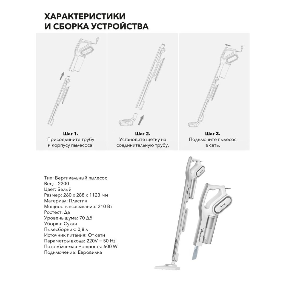 вертикальный, сеть, потребление: 600 Вт, без регулировки мощности, шум 75 дБ