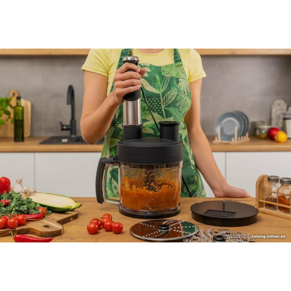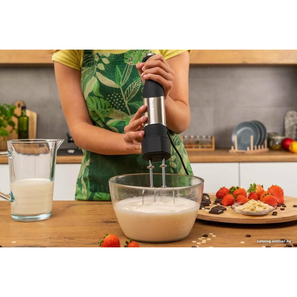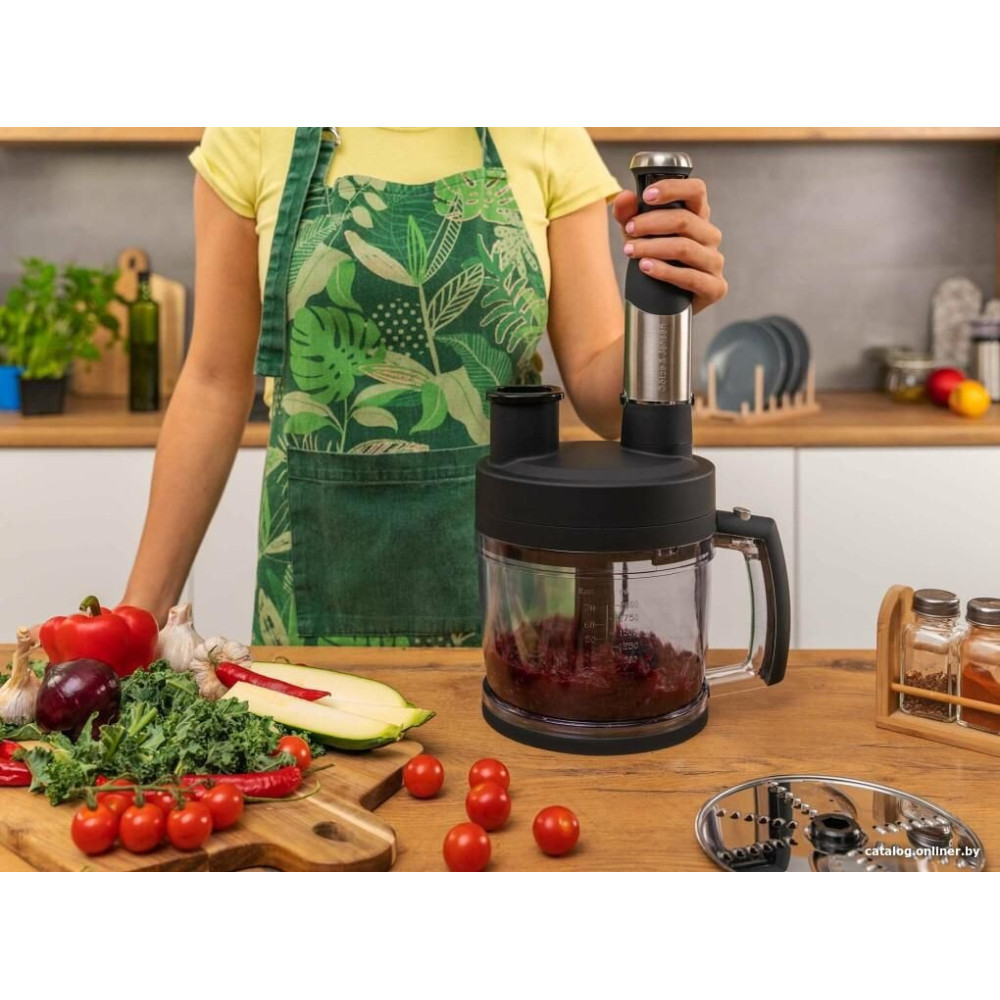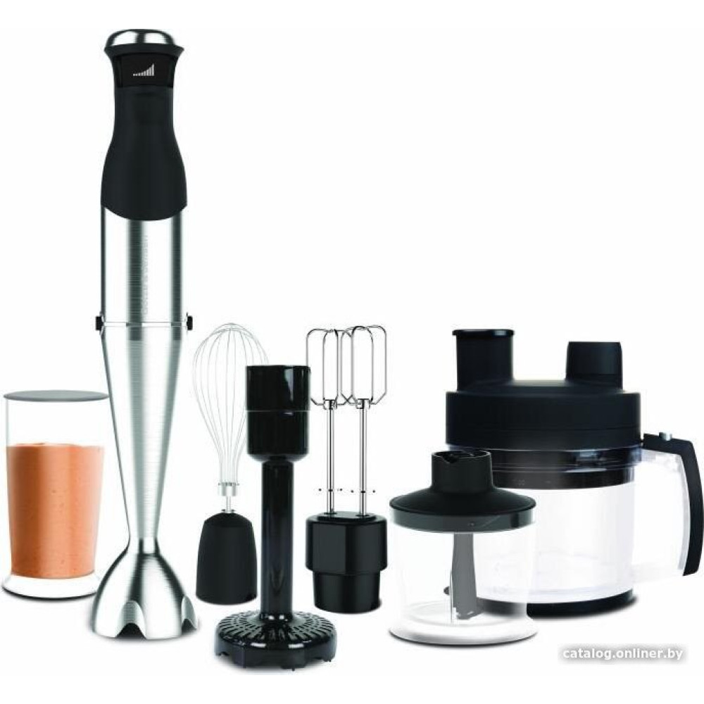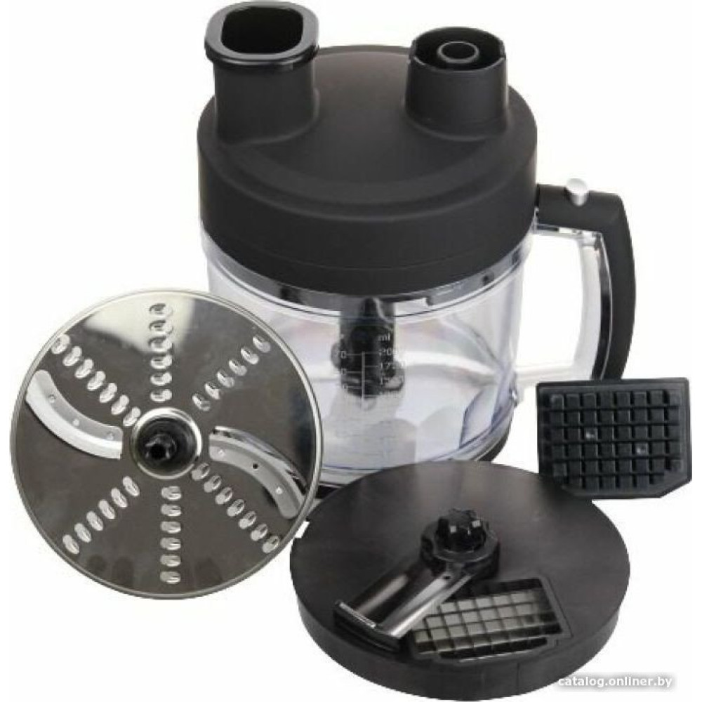 - Комплектация венчик, двойной венчик, насадка для пюре, измельчитель объемом 500 мл, блендер объемом 2 л с набором принадлежностей, мерный стакан объемом 600 мл и руководство пользователя
