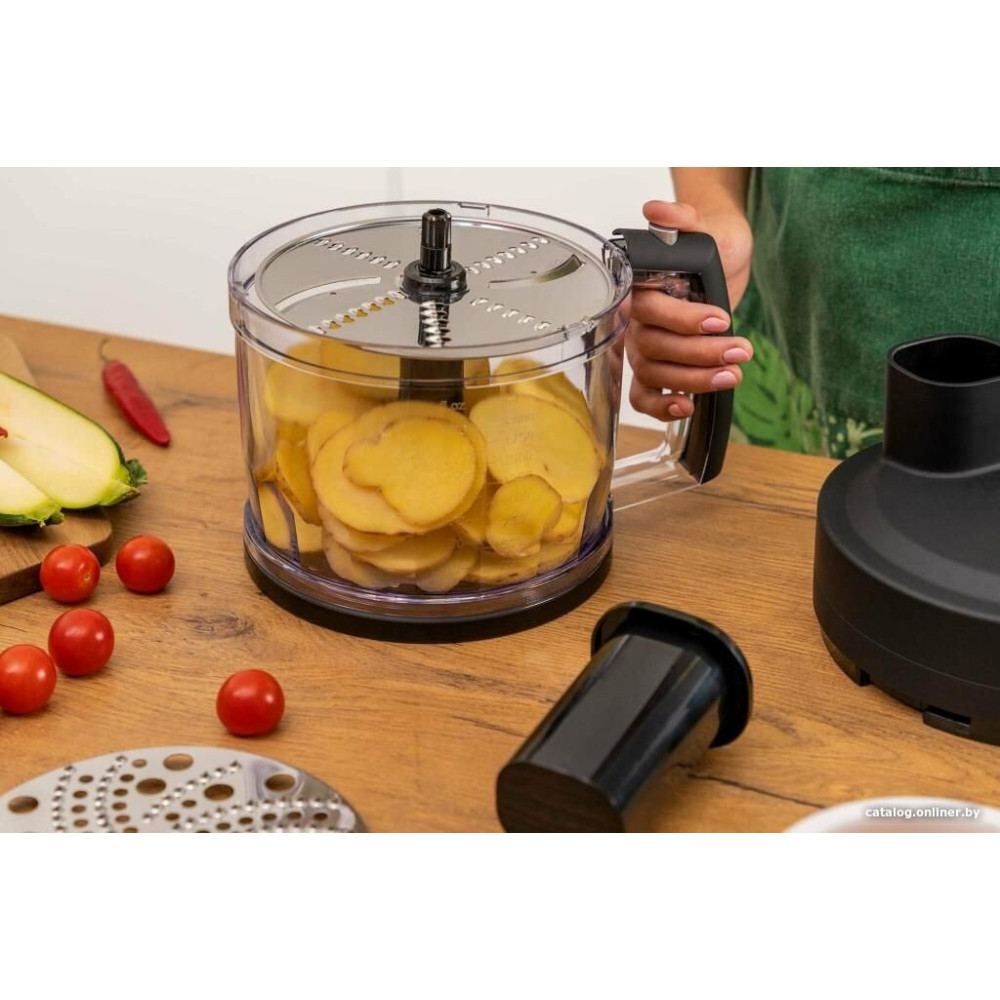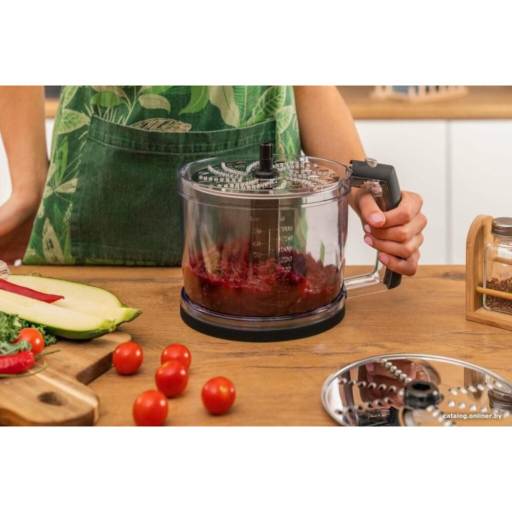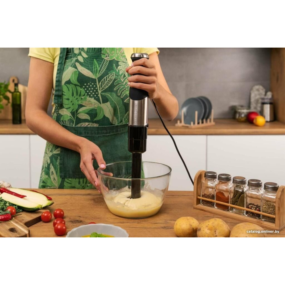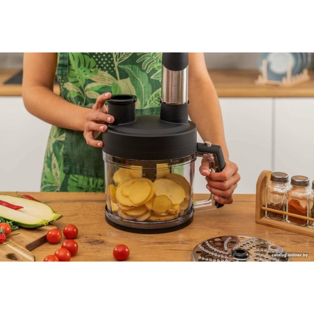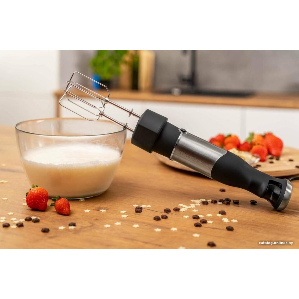 - Комплектация венчик, двойной венчик, насадка для пюре, измельчитель объемом 500 мл, блендер объемом 2 л с набором принадлежностей, мерный стакан объемом 600 мл и руководство пользователя