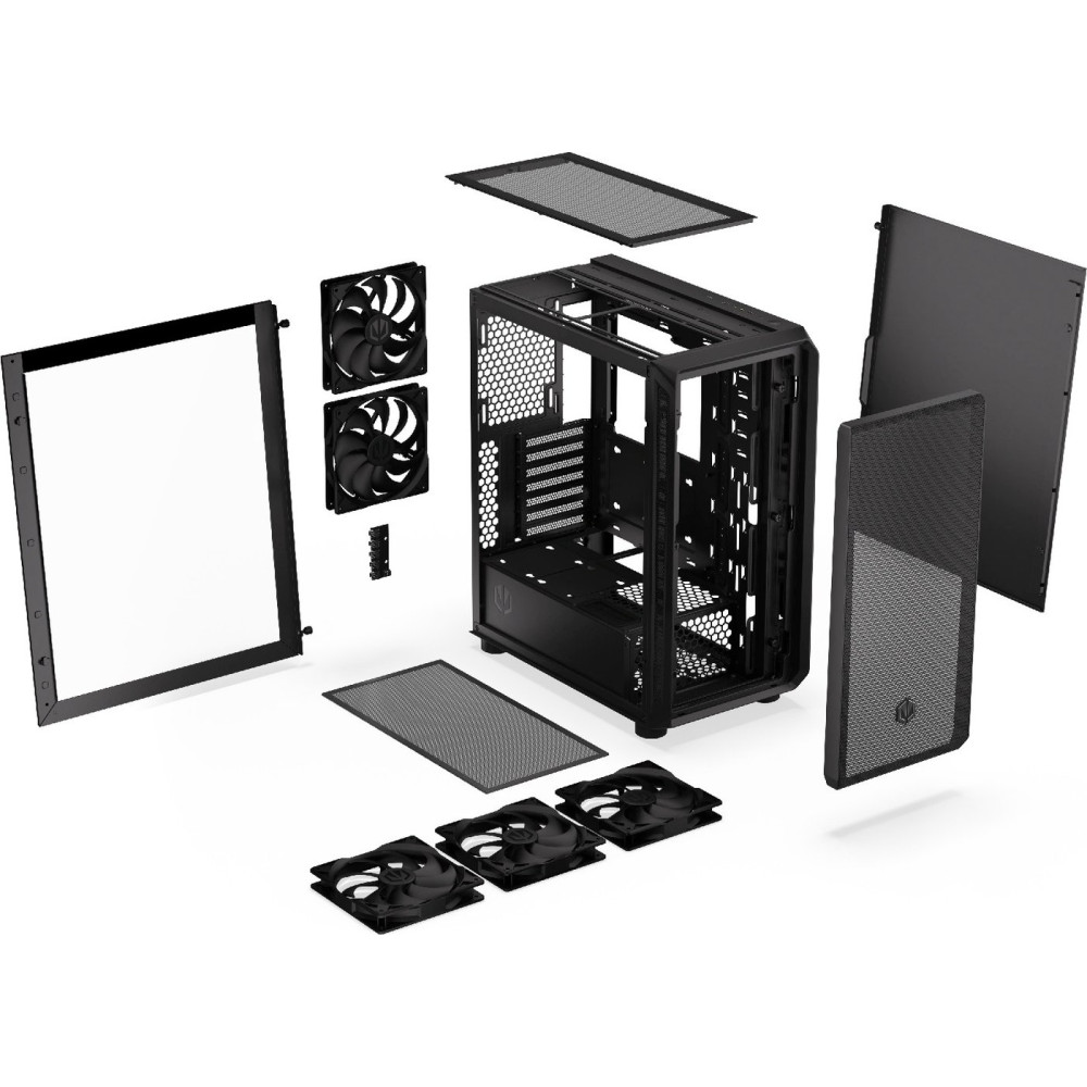 Mid Tower, БП отсутствует, для плат ATX/micro-ATX/mini-ITX, с 5 вентиляторами в комплекте, с контроллером вращения, окно: закаленное стекло, видеокарта до 350 мм, охлаждение ЦП до 179 мм, пылевой фильтр - сверху/спереди/снизу, 2xUSB-A 3.2 5Гбит/с, 1xUSB-C 3.2 10Гбит/с, цвет черный