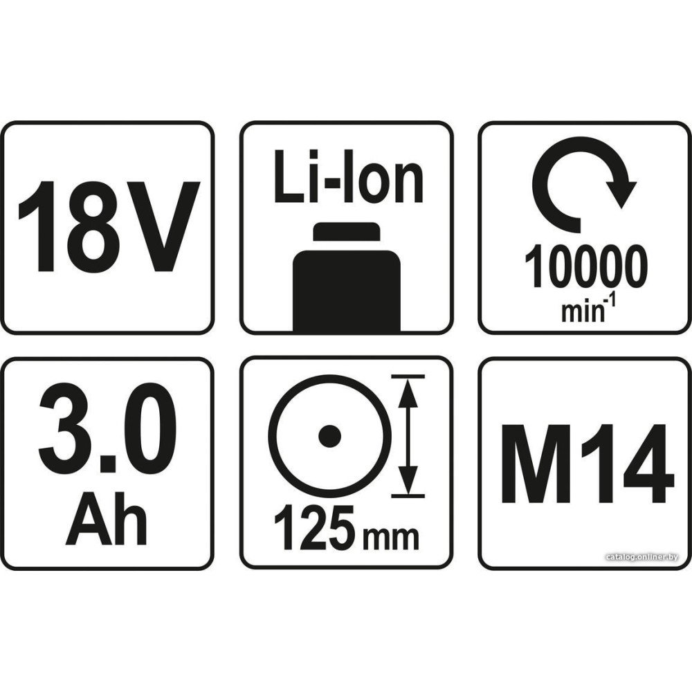 диаметр диска: 125 мм, 10000 об/мин холостого хода, питание: аккумуляторный (18 В), аккумулятор в комплекте