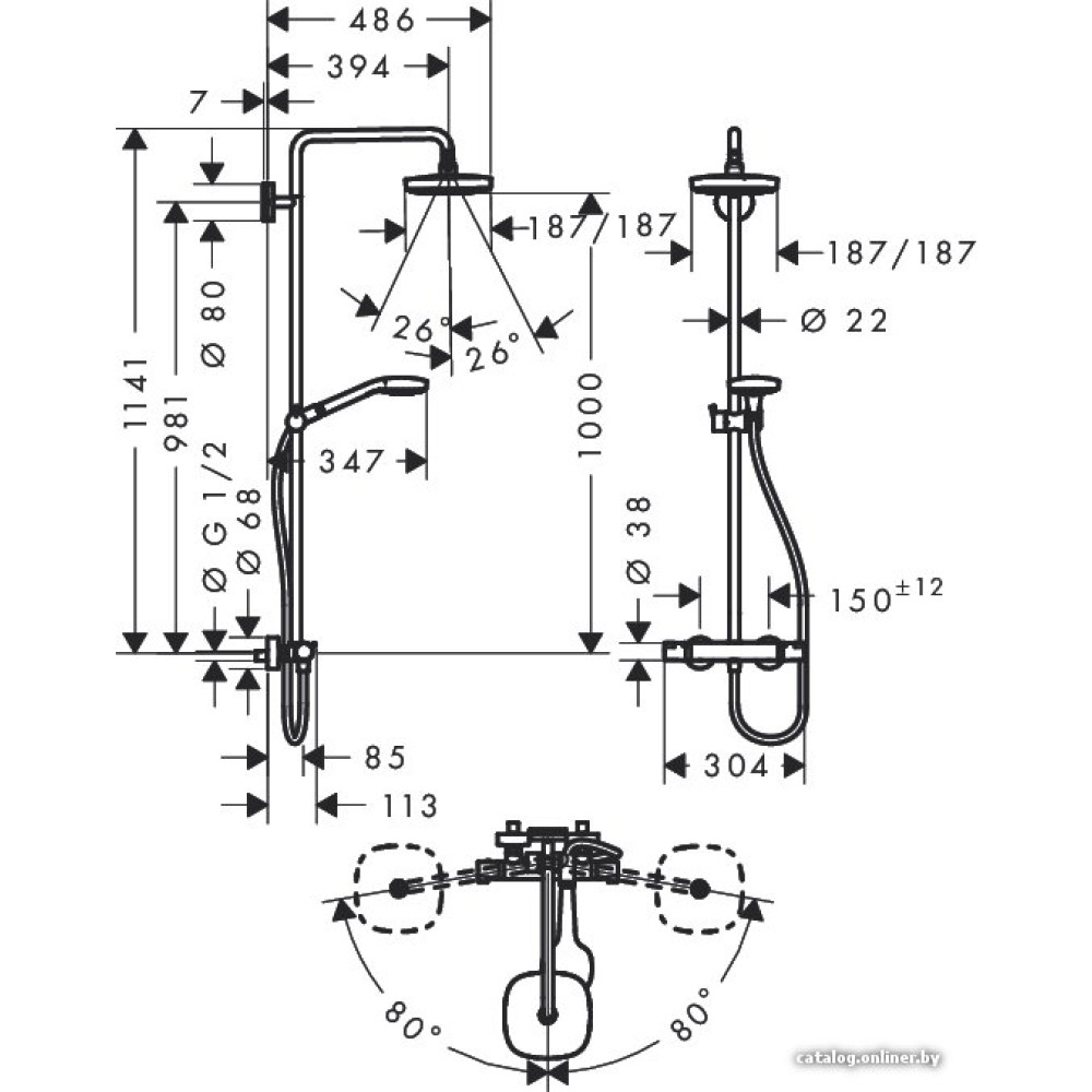 - Вылет верхнего душа394 мм