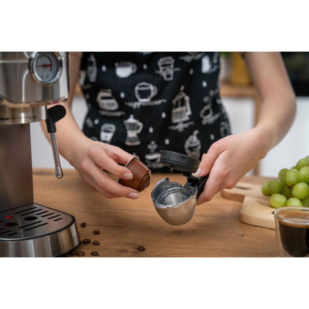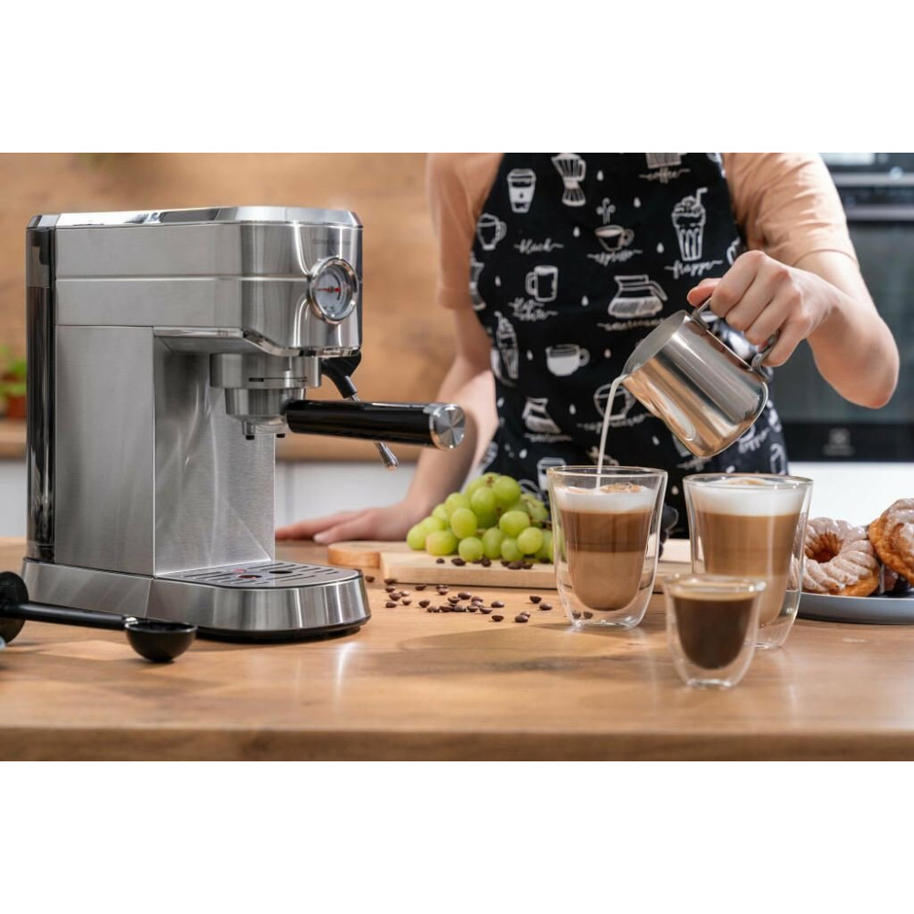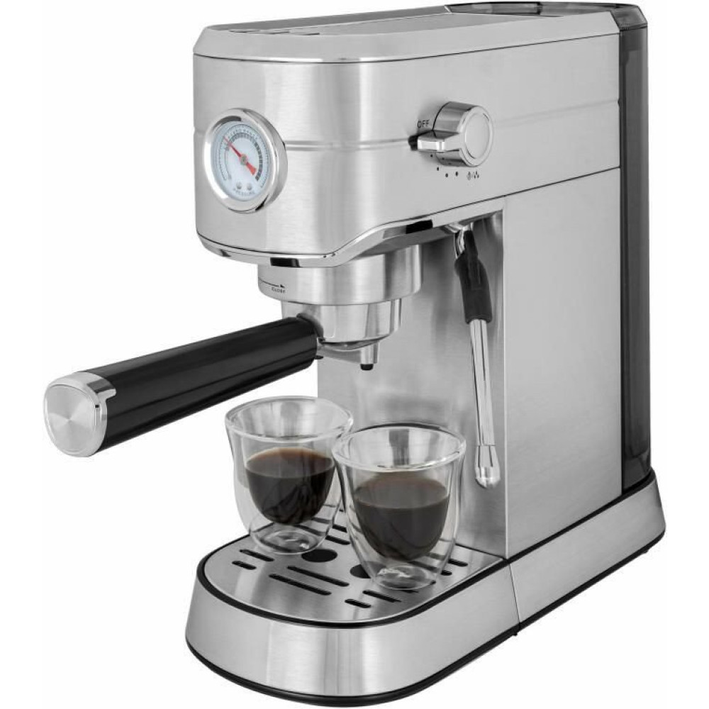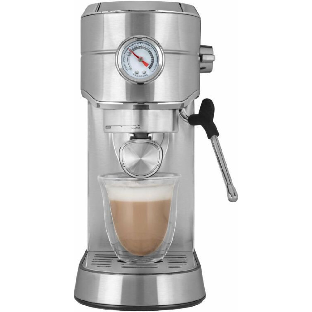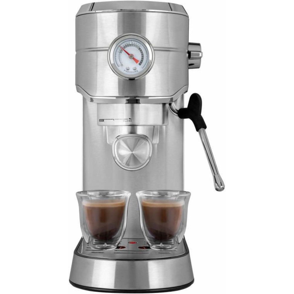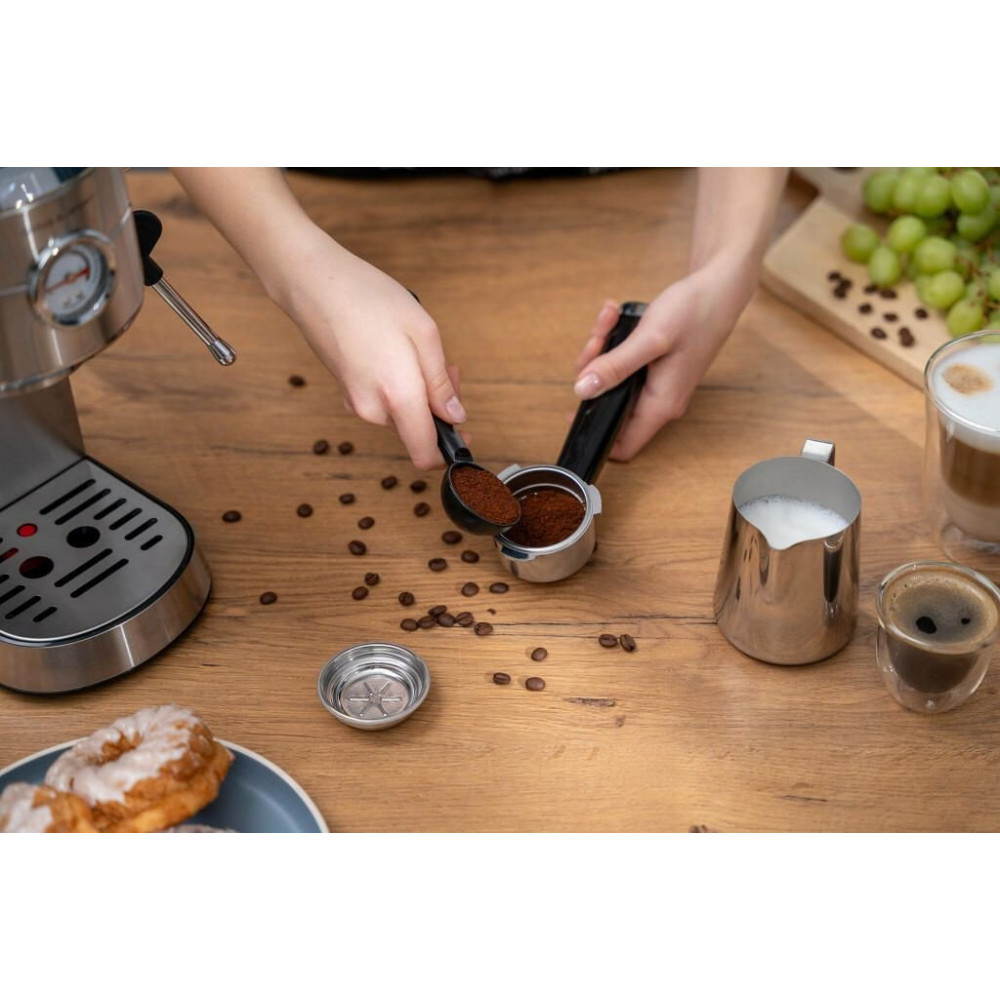 1450 Вт, корпус металл, капучинатор ручной, используемый кофе: молотый, цвет серебристый