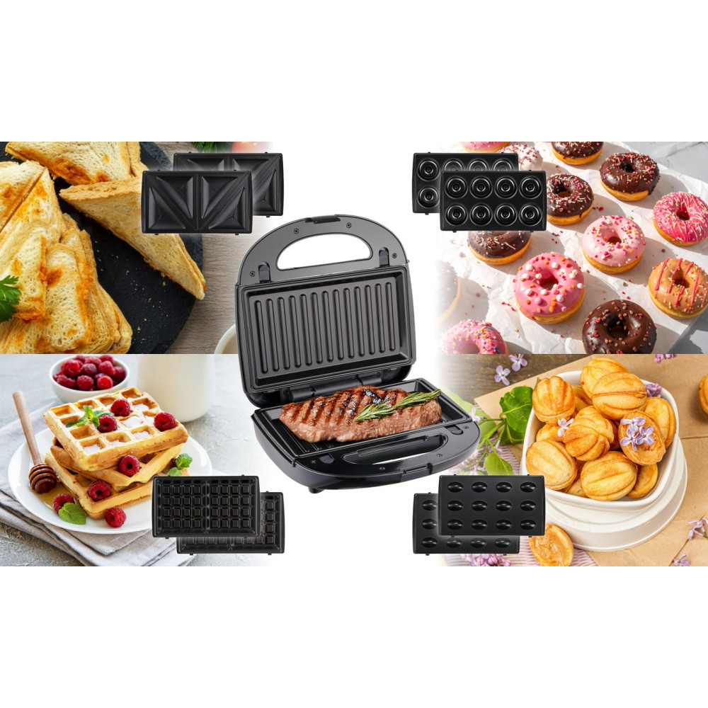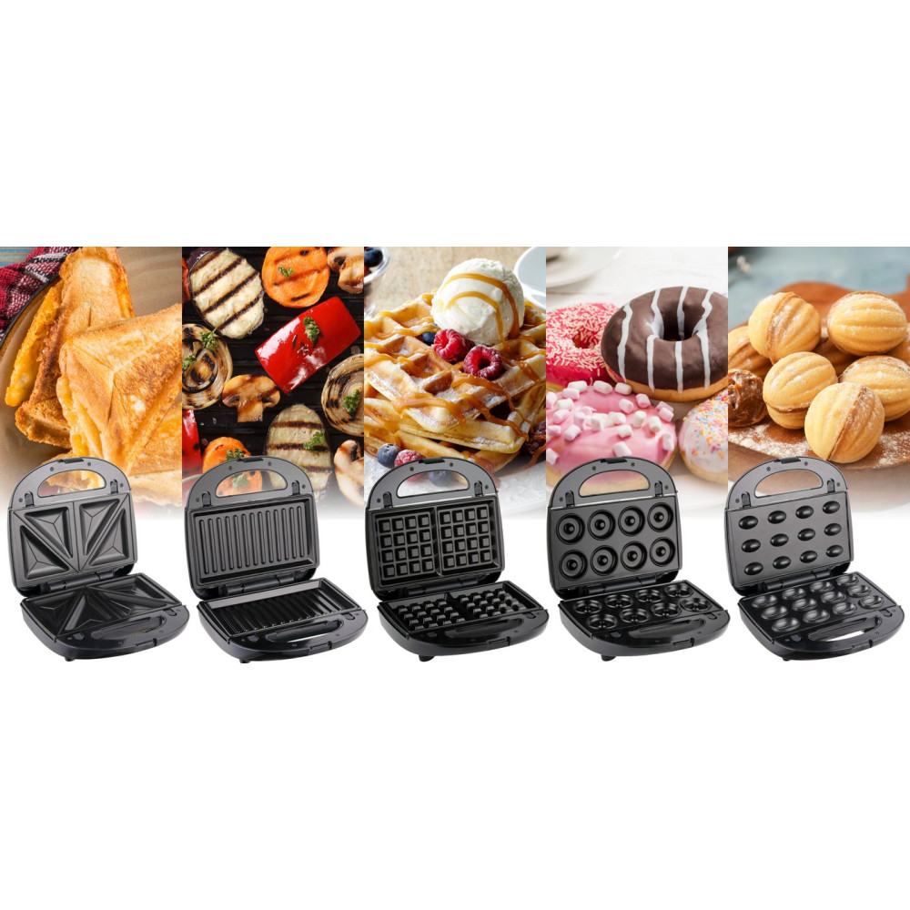 многофункциональная сэндвичница, 850 Вт, поверхность: гриль-пластина/форма для 2 ломтиков хлеба/вафельница/орешница/мини-кексы, съемные плитки, вид выпечки: венские (бельгийские) вафли/орешки/пончики/гриль/сэндвич, черный
