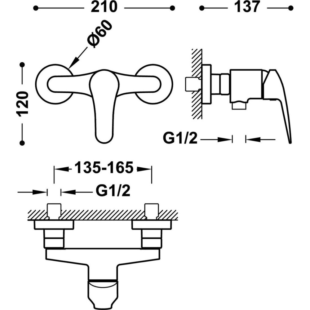 душевой гарнитур (без верхнего душа), настенный монтаж, механический смеситель, ручной душ