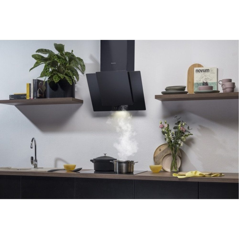 конструкция наклонная, монтаж настенный, ширина 60 см, управление сенсорное, производительность вытяжки 650 м³/ч, цвет черный