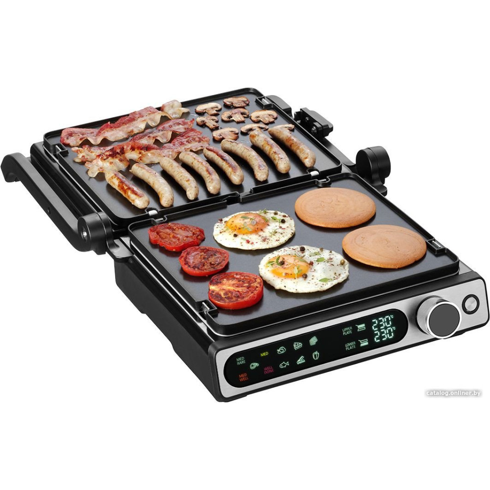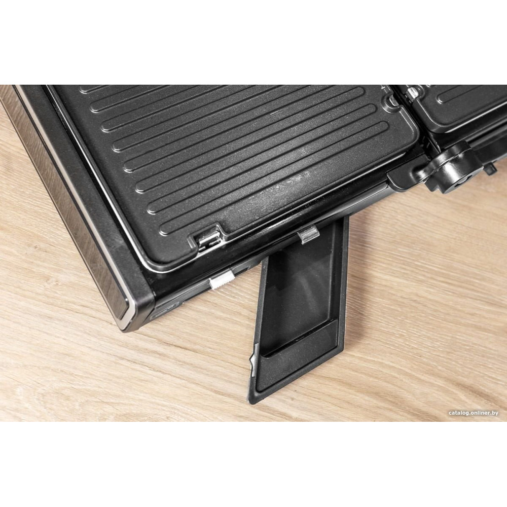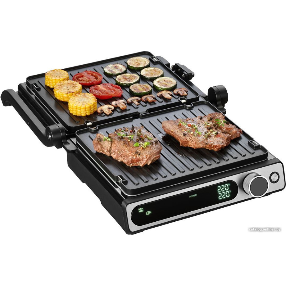 - Комплектация Электрогриль со съемными нагревательными пластинами: гладкая и ребристая, термометр, скребок
