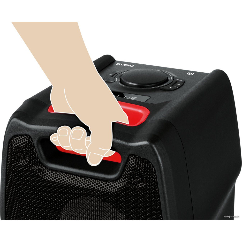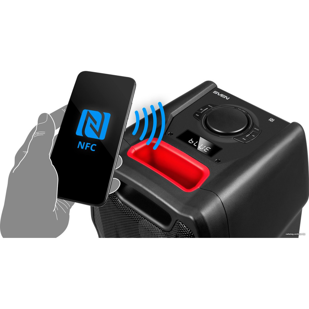 номинальная мощность 100 Вт, воспроизведение с USB/microSD, питание от сети и аккумулятора, BT, NFC, AUX
